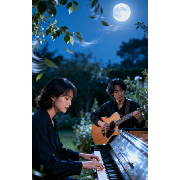 neo classical duet, ambient minimalism, 62BPM, classical guitar and grand piano, inspired by Erik Satie and Chopin, nocturnal serenity, soft arpeggios, gentle sustain, warm natural reverb, harmonic simplicity, meditative tone, slow breathing tempo, moonlit tranquility, ‑drums, ‑percussion, ‑bass, ‑cello, ‑violin, ‑strings, ‑flute, ‑synth, ‑pad, ‑vocals, ‑choir, ‑beats, ‑rhythm section, ‑field recording, ‑electronic elements, ‑ambient noise, ‑cinematic drums, ‑orchestral instruments, ‑sound effects