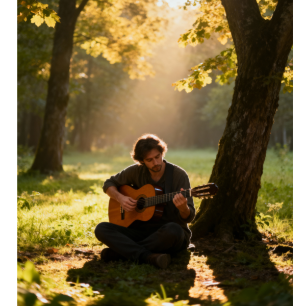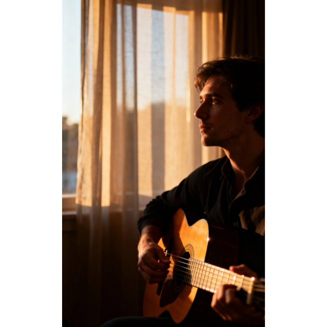 neo classical guitar solo, romantic impressionism, 6/8 time signature, 72BPM, nylon string guitar, warm natural tone, inspired by Chopin and Tárrega, gentle arpeggios, nostalgic melody, subtle rubato phrasing, soft room reverb, emotional minimalism, late afternoon light mood, ‑piano, ‑drums, ‑percussion, ‑bass, ‑cello, ‑violin, ‑strings, ‑flute, ‑synth, ‑pad, ‑vocals, ‑choir, ‑beats, ‑rhythm section, ‑field recording, ‑electronic elements, ‑cinematic drums, ‑ambient noise, ‑orchestral instruments, ‑sound effects