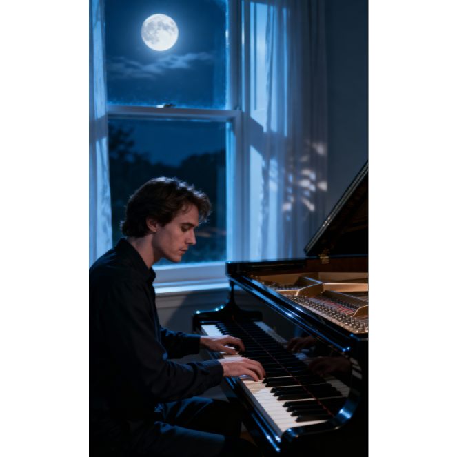 impressionist piano solo, romantic nocturne, 58BPM, solo grand piano, soft pedal throughout, warm reverb, moonlight tone palette, inspired by Chopin and Debussy, lyrical phrasing, cinematic serenity, gentle rubato, emotional stillness, night reflection mood, ‑guitar, ‑drums, ‑percussion, ‑bass, ‑cello, ‑violin, ‑strings, ‑flute, ‑synth, ‑pad, ‑vocals, ‑choir, ‑beats, ‑rhythm section, ‑field recording, ‑electronic elements, ‑ambient noise, ‑orchestral instruments, ‑cinematic drums, ‑sound effects