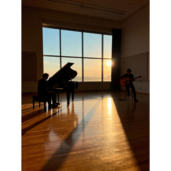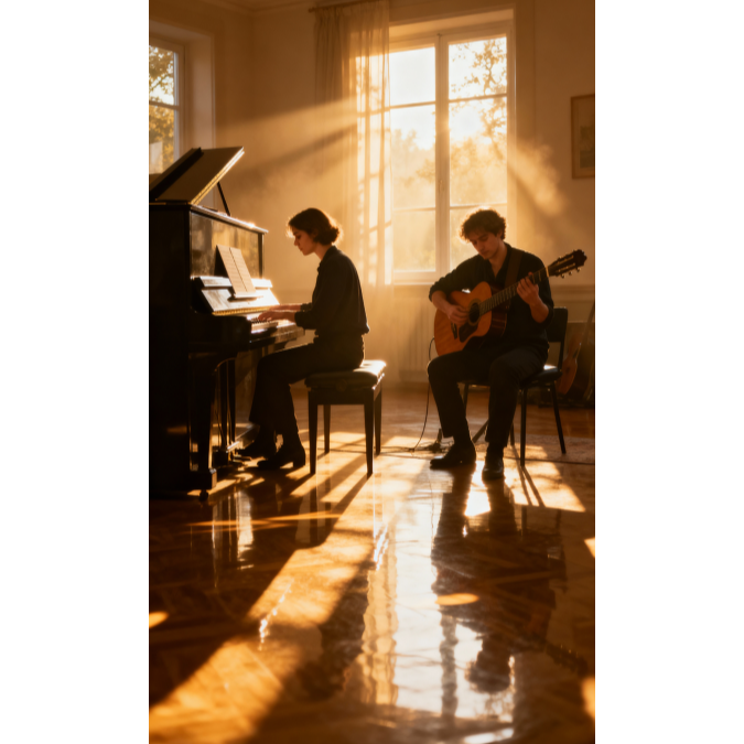 neo classical duet, ambient chamber, 70BPM, classical guitar and grand piano, inspired by Chopin and Tárrega, romantic impressionism, soft arpeggios, warm reverb, expressive phrasing, conversational melody exchange, afternoon light tone, natural stereo balance, emotional intimacy, ‑drums, ‑percussion, ‑bass, ‑cello, ‑violin, ‑strings, ‑flute, ‑synth, ‑pad, ‑vocals, ‑choir, ‑beats, ‑electronic elements, ‑ambient noise, ‑field recording, ‑rhythm section, ‑cinematic drums, ‑sound effects, ‑orchestral instruments