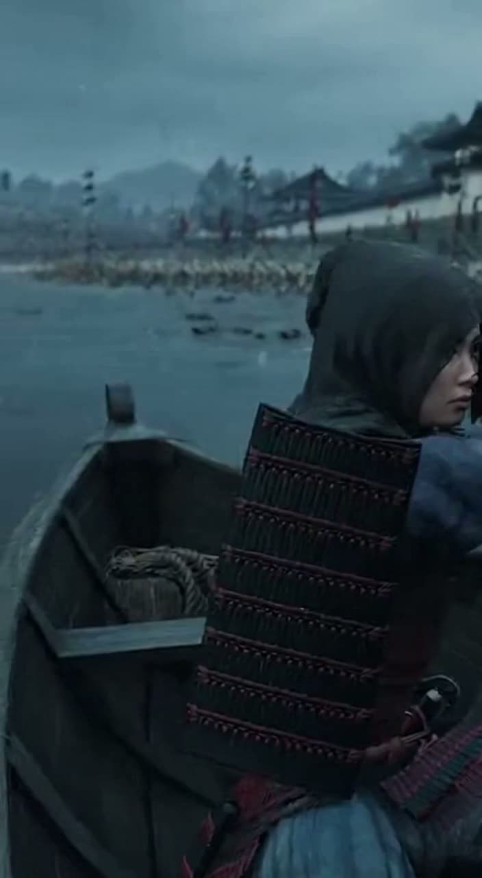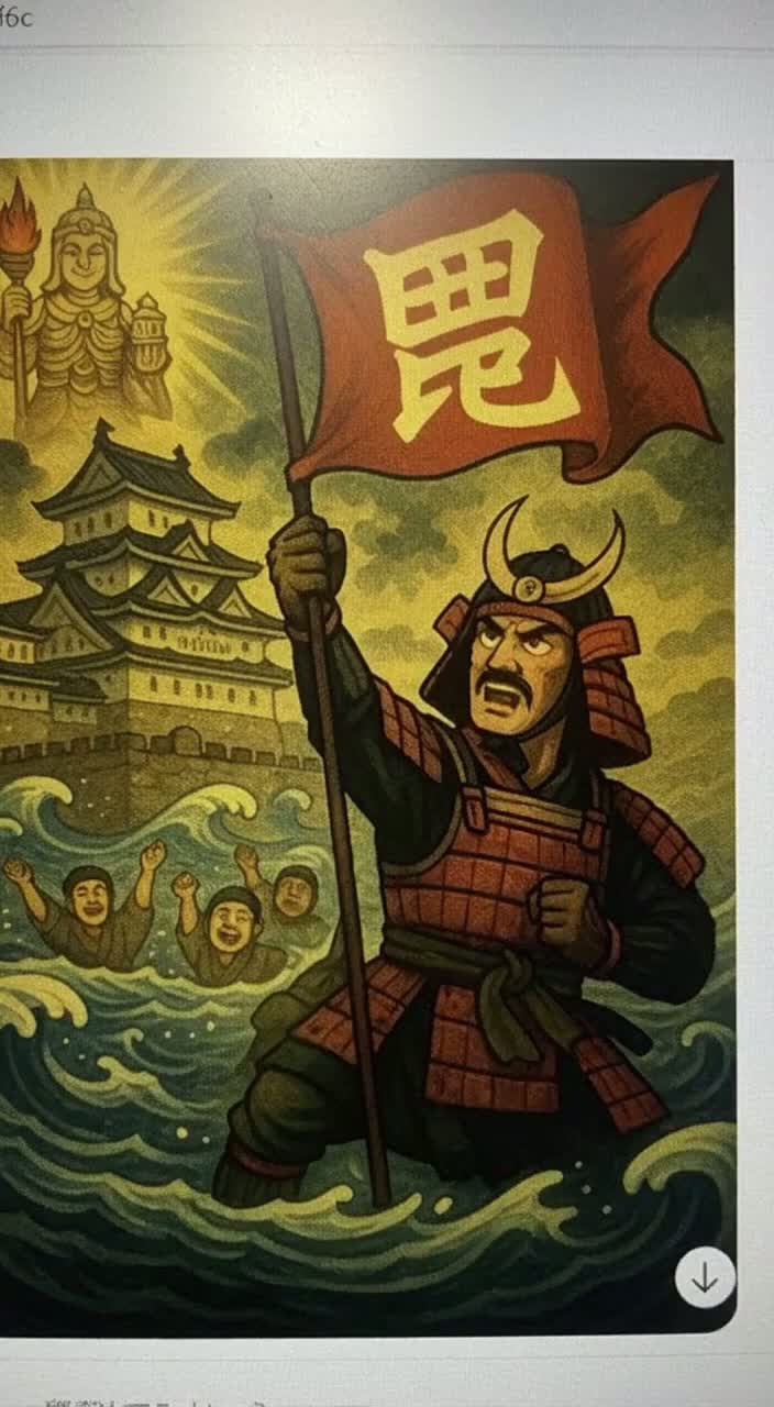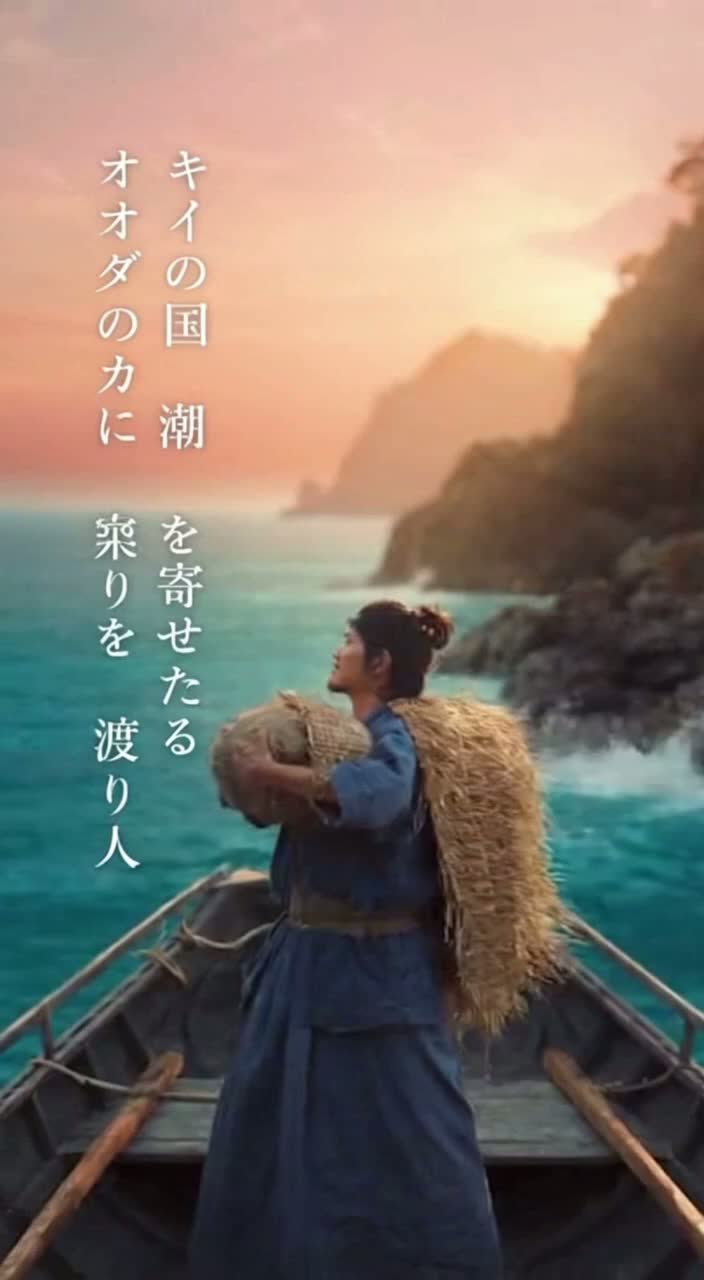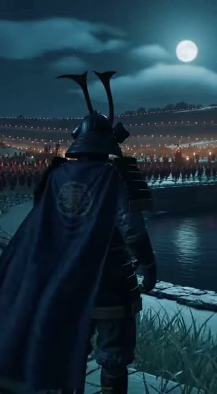 Epic Cinematic Rock Ballad, deep and resonant male vocal, slow and dramatic tempo, orchestral strings and brass for grandeur, shakuhachi and shamisen for historical atmosphere, powerful electric guitar leads and sustained chords, strong rock drums with timpani and taiko reinforcement, wide reverb and emotional dynamic build, heroic and solemn mood