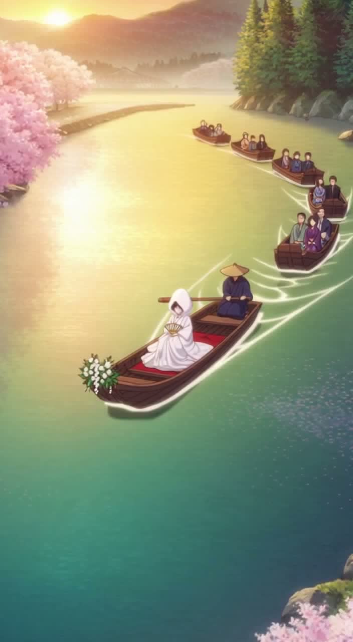 Japanese Enka × Okinawan folk ballad, bittersweet wedding song, slow and graceful, 72–78 BPM, female lead vocal with deep emotion and elegance, nostalgic and ceremonial mood, flowing river imagery, blessing mixed with quiet sorrow, traditional Japanese melody, Okinawan folk color, sanshin, shamisen, soft taiko, gentle piano, subtle strings, airy flute, sparse percussion, expressive vibrato, dignified and poetic, melancholic but beautiful, cinematic build, intimate verses, emotionally swelling chorus, final chorus like a prayer carried by the river