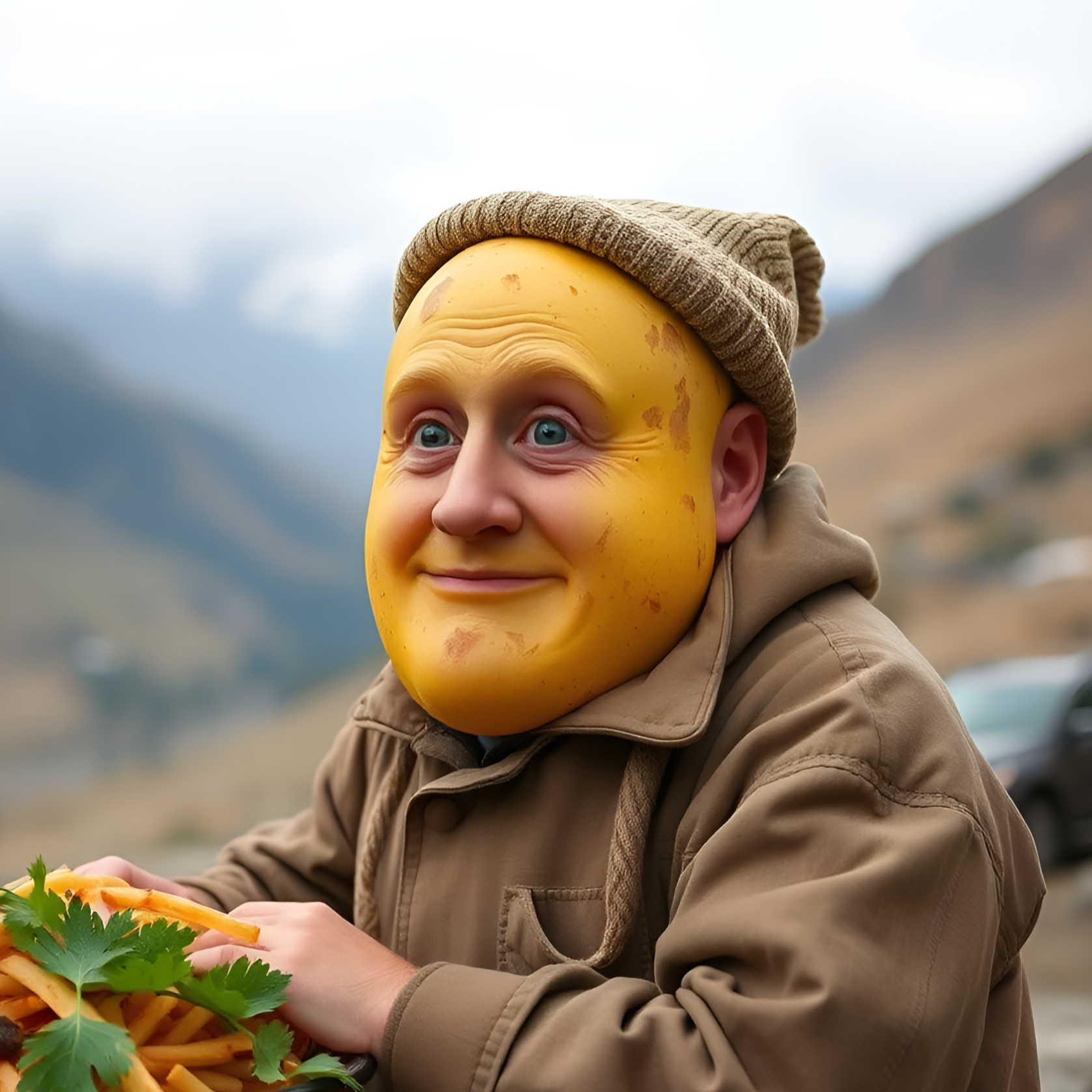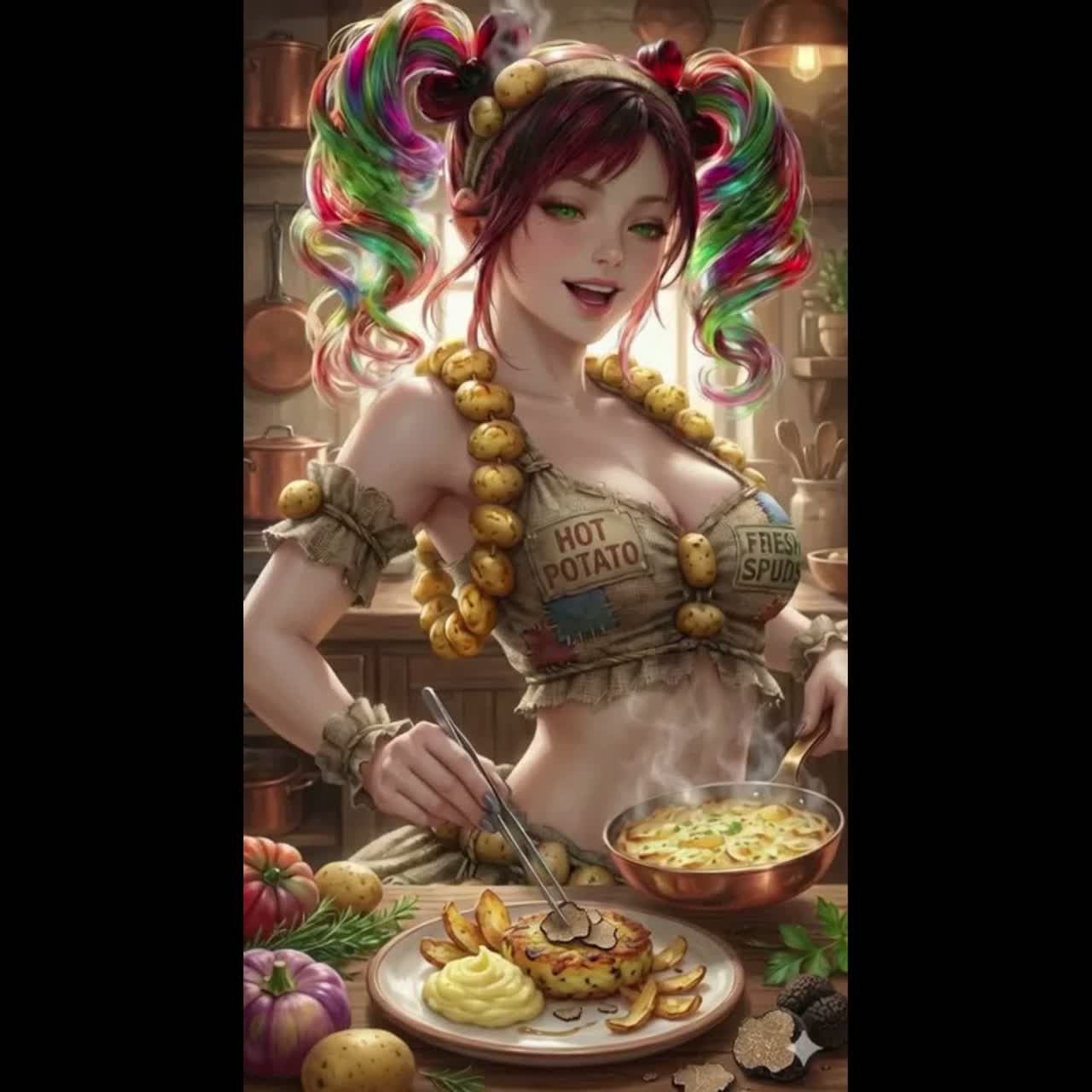 [style: theatrical, nostalgic, humorous, highly rhymed, catchy hooks; male lead with spoken-word verses and explosive sung choruses; vibe inspired by Panic! At The Disco — energetic, theatrical, playful, slightly dramatic; keep structure with labeled sections and pause-marking (- / -- / ---); explicit motif: potatoes ("Oh, Potatoes" appears in chorus); phrasing built for near-spoken delivery and comedic timing; instrumentation implied only as mood drivers (bright, punchy, dramatic) — no technical attributes included; repeat chorus; allow space for actor-like delivery and layered harmonies on chorus repeats, ]