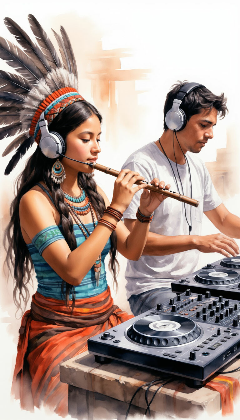 Slow, Rave, Drum and Bass, A slow, meditative Native American folk composition, The core is rhythmic drums and a melodic flute, At the center is a powerful yet gentle Native American folk chant, possibly with elements of throat singing or drawn-out notes, electro guitar in choruss culmination