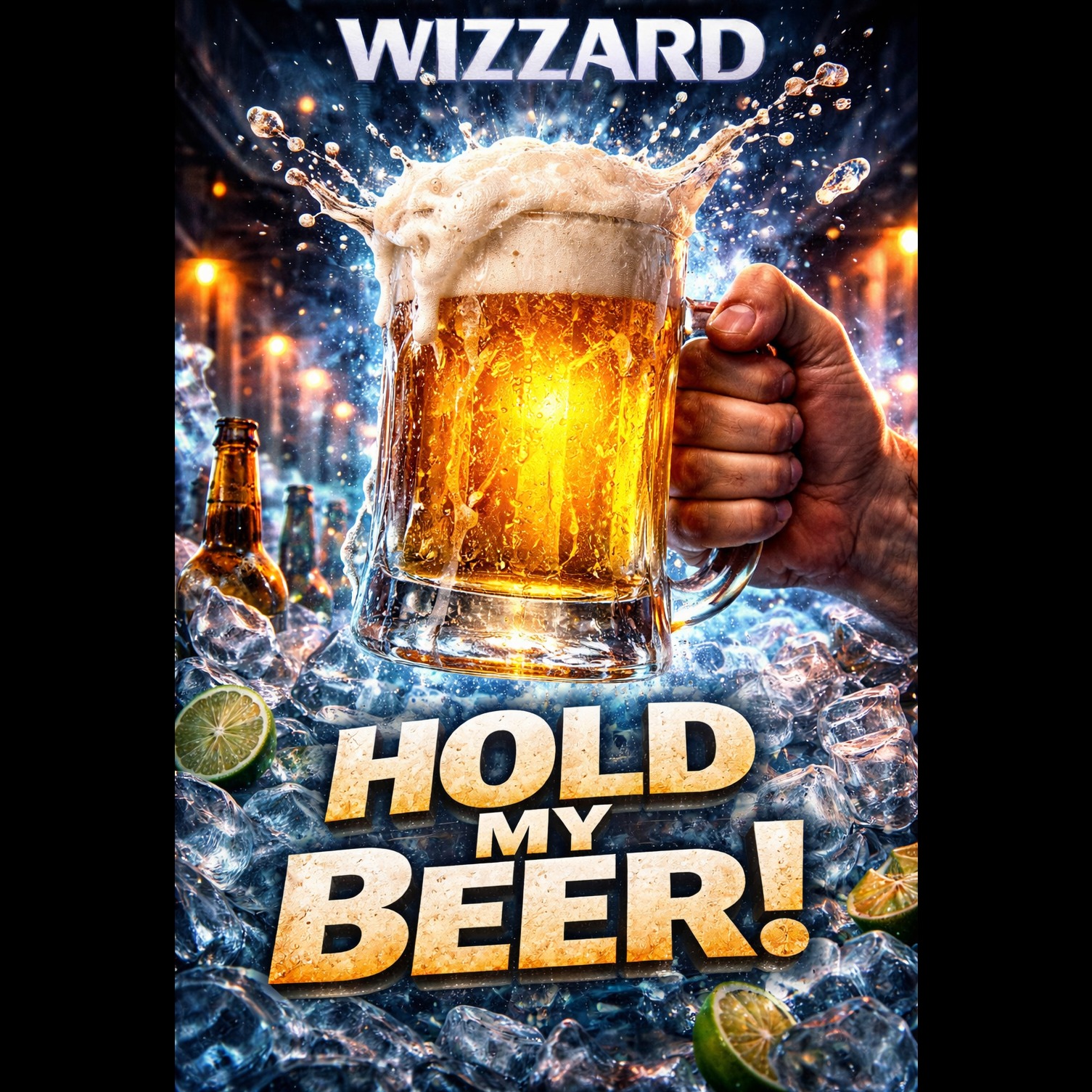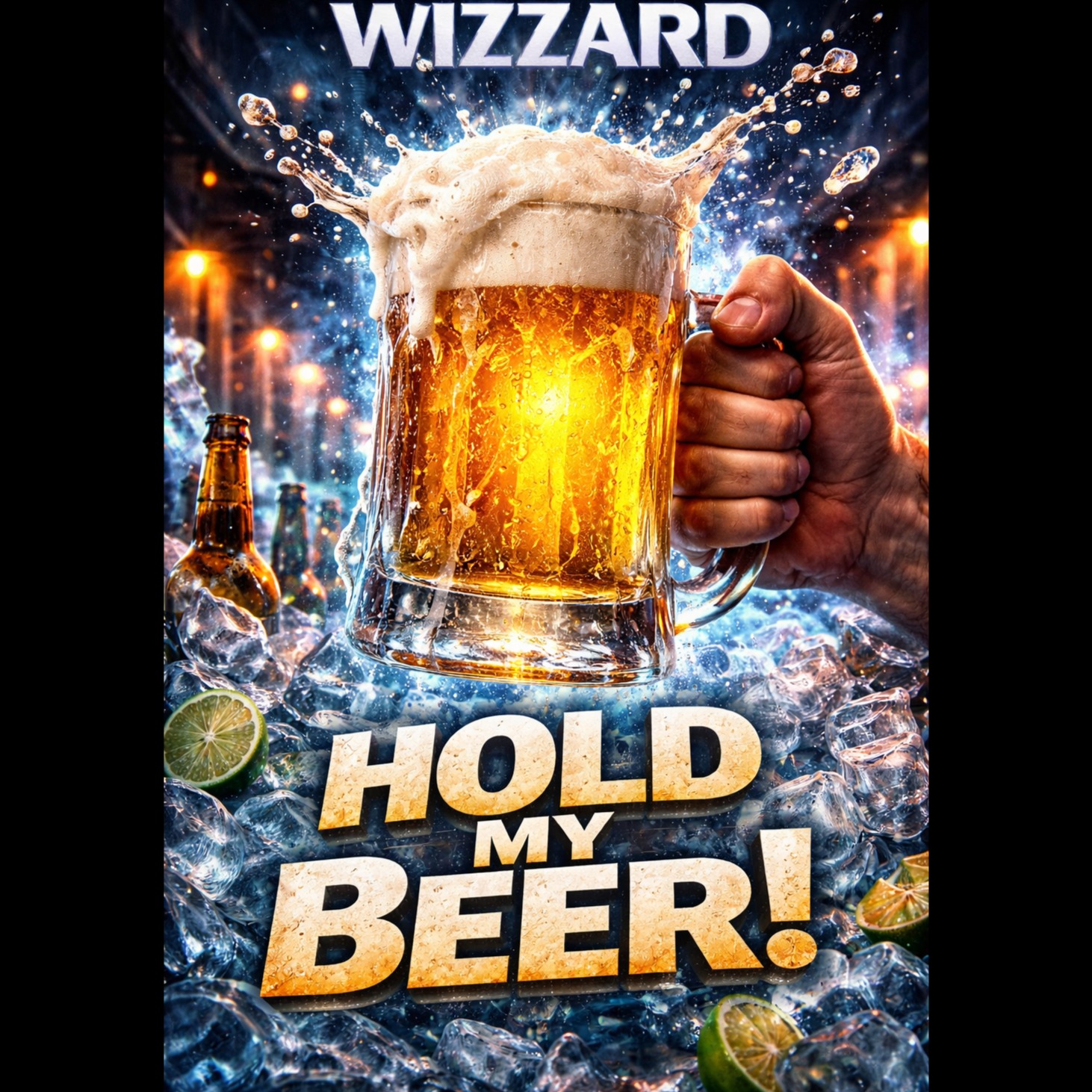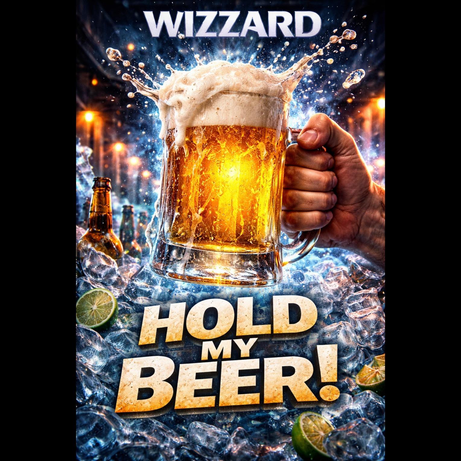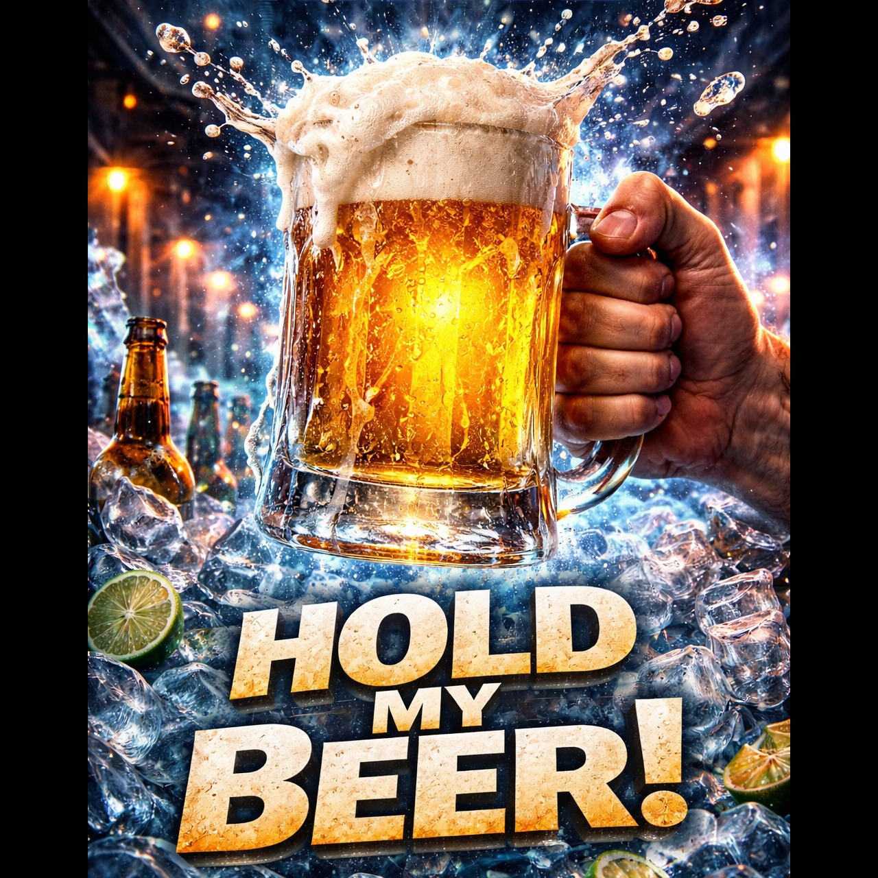 Dark, high-energy electro-techno fused with trap bass music, Driving four-on-the-floor kick with crisp club production and aggressive sidechain pump, Dirty distorted electro bassline with rhythmic movement and gritty synth modulation, Trap hi-hat rolls, sharp snare claps, and deep sub hits add bounce and swagger, Bright rave synth stabs and tense atmospheric textures build pressure, Single catchy male vocal phrase: “hold my beer” delivered with confident, cocky energy, The vocal repeats rhythmically, building anticipation before explosive drops, Background hype ad-libs and crowd-style shouts punctuate transitions and drops, adding playful party energy, Heavy distorted synth leads, punchy electro grooves, and booming trap sub create a festival-ready club track with playful swagger and massive peak-time drops