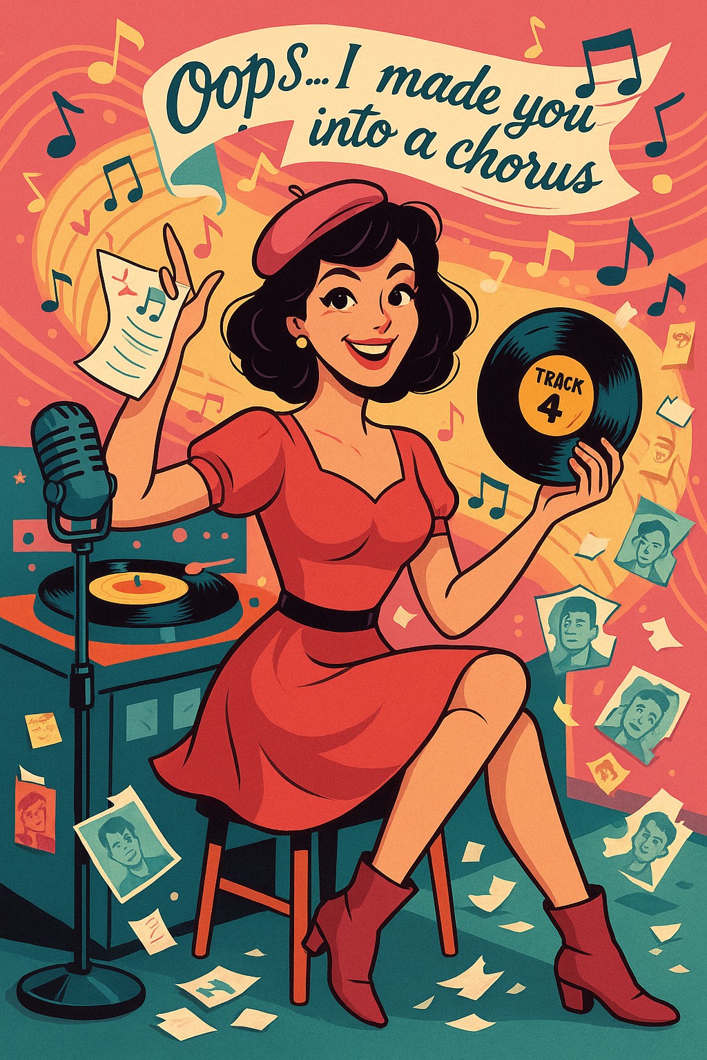 Funky tango-pop x swing-rap fusion, Tempo 108 BPM, Bold, sassy female vocal, Groovy basslines, dramatic staccato strings with tango flair, Snappy percussion (claps, kicks, castanets), muted trumpet or accordion accents, Style is playful and theatrical, with sudden rap-spoken inserts (sarcastic, lyrical, whip-smart), Tone is sweet on the surface, but venomous beneath—like a glittery revenge tango, Verses tell the story of a flaky ex who said “I’m not ready” while still kissing and taking, Chorus is singable, punchy, and ironic (“Oops, I made you into a chorus”), Add cheeky breakdown with kazoo or flute for comic flair, Contrast warm vocals with lyrical blade, For a woman who laughs while she tangoes on the ghost of mixed signals, Scene: cabaret stage, spotlight on her, ex in the front row realizing he inspired track 4