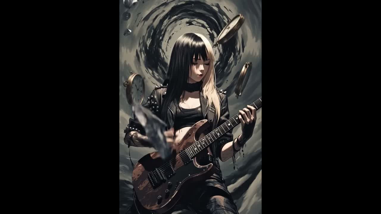 J-Pop and Electronic Rock fusion, Distorted electric guitars play syncopated power chords and palm-muted riffs, A prominent synthesizer plays high-pitched, staccato lead melodies with a digital, square-wave timbre, The drums feature a driving 4/4 kick pattern with crisp snare hits and rapid hi-hat rolls, A slap bass guitar provides a rhythmic, percussive low-end, Female vocals are processed with light pitch correction and doubling, delivered in a fast-paced, rhythmic style, The arrangement includes frequent electronic transitions, riser effects, and sudden instrumental drops, Key: G Minor, Tempo: 175 BPM