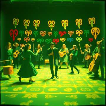 Traditional Celtic music, big orchestra, brass ensemble, male choir, percussion, William Walton, Ralph Vaughan Williams, Irish, dance, Dorian mode, Ray scale, Lydian scale, Phrygian scale, call and response, hand over, fiddle, bagpipes, Irish harp, Irish flute, Recorder, Corna muse, hand drum, hand bell, fast, drone bass, viola da gamba, big drum, intense, lively, nostalgic, ‑Piano solo, ‑Piano accompaniment, ‑Piano ceponcerto, ‑concerto, ‑drums, ‑percussion