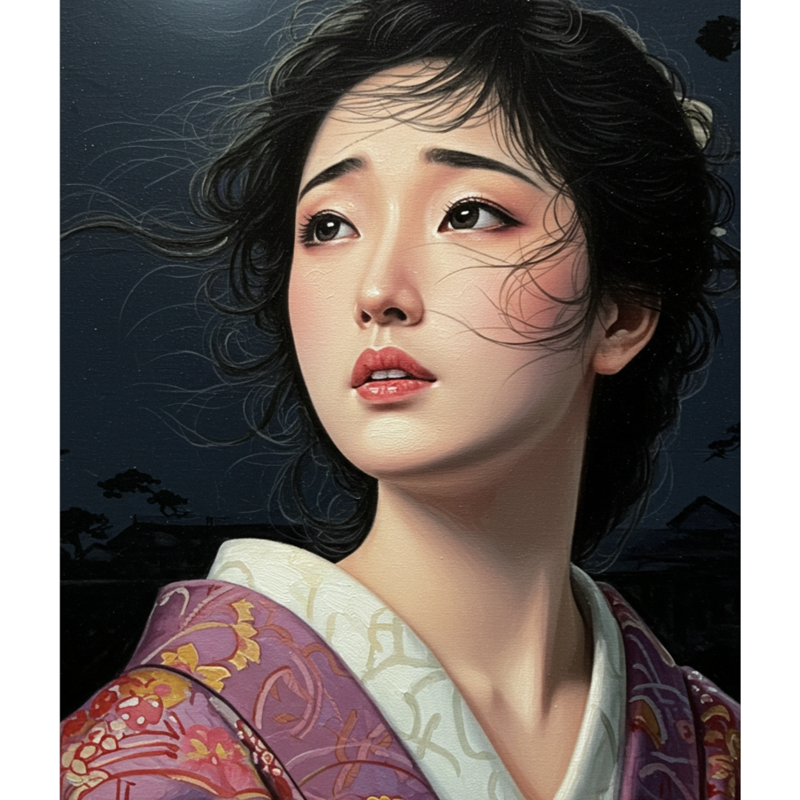 A powerful, dramatic, and uptempo power enka-style track with intense emotional delivery and sweeping melodic phrasing, The rhythm is bold and dynamic, driven by steady, thunderous taiko drums and expressive pauses that emphasize the singer’s inner turmoil, Traditional Japanese instruments such as shamisen and shakuhachi add a rich, cinematic texture, The vocals are passionate, raw, and filled with sorrow, rage, and longing—perfect for a story of betrayal, unforgotten love, and tearful solitude in a seaside tavern or snowy mountain pass, The soundscape evokes the harsh, roaring waves of the northern sea in winter, echoing through blizzards, wind-lashed cliffs, and stormy coastlines, The atmosphere is dark, theatrical, and emotionally explosive, echoing through stormy landscapes and flickering lanterns