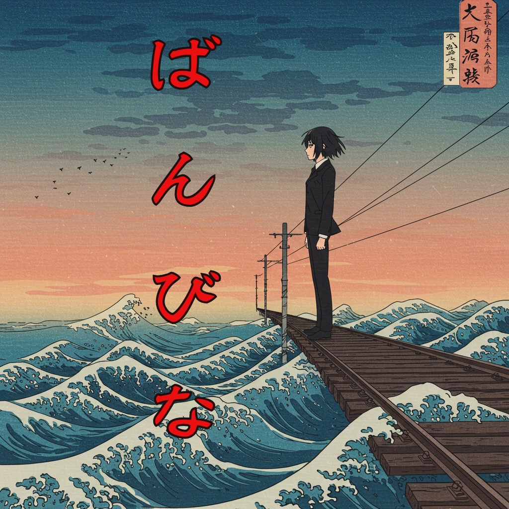 A unique fusion of retro, energetic 1970s American road vibe and dramatic Japanese enka style, The song begins with a short intro and launches into a powerful, up-tempo melody, Funky rhythms, warm vintage tones, and groovy bass lines meet traditional Japanese instruments like shamisen, shakuhachi, and cinematic strings, Rhythmic taiko drums provide a strong, energetic pulse, The lead vocal is a dramatic, emotional female performance with intense vibrato, inspired by "Amagi-goe", singing lyrics full of poetic metaphors and a strong desire to work and prove oneself, The mood is soulful, intense, and nostalgic, blending the freedom of dusty American highways and dancing bell-bottom-clad crowds with the theatrical longing of enka, Slight vinyl textures, motion blur, and sun flares enhance the atmosphere, Traditional meets funk — full of power, soul, and determination