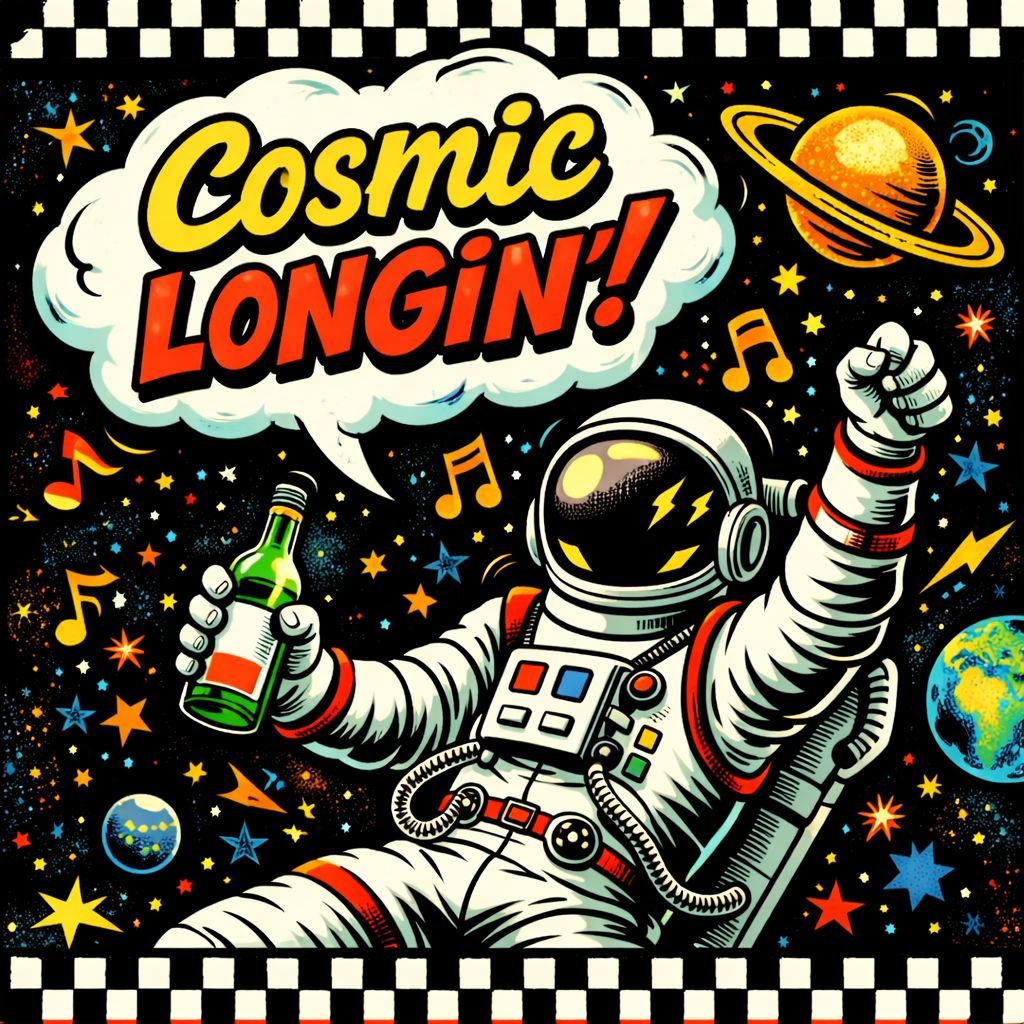 upbeat third wave ska-punk, fast skanking guitars, punchy horns, energetic male vocals + gang shouts, bouncy offbeat rhythm, adventurous space romance anthem, 170-185 bpm, trumpet stabs, driving walking bass, super catchy explosive energy