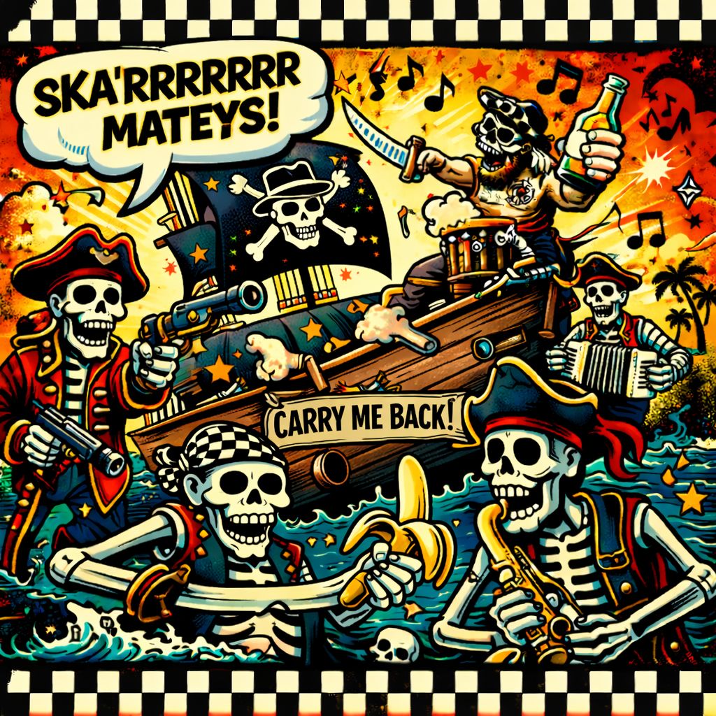 upbeat third wave ska-punk, fast skanking guitars, punchy horns, energetic male vocals + gang shouts, bouncy offbeat rhythm, adventurous pirate sea shanty romance anthem, 170-185 bpm, trumpet stabs, driving walking bass, super catchy explosive energy