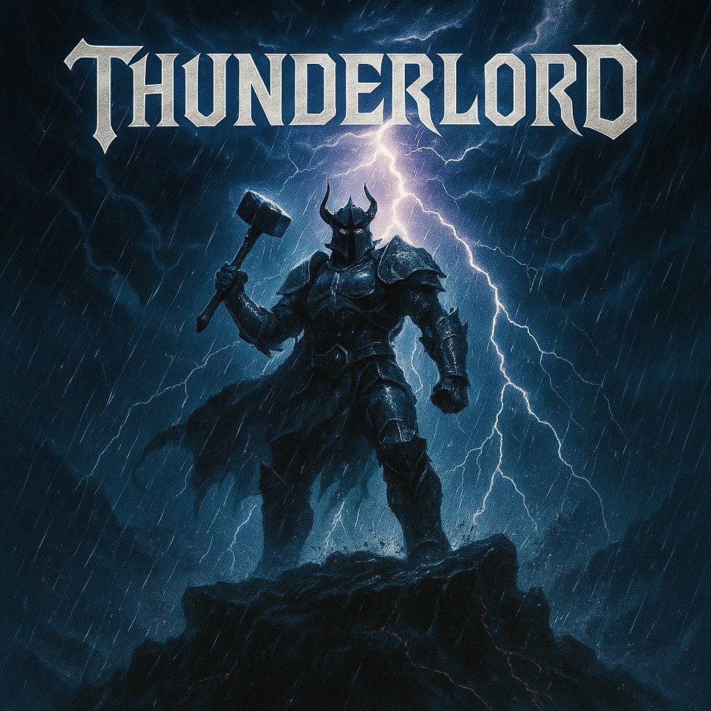 A dramatic heavy metal anthem framed by a dark spoken intro and outro, like a storm prophecy, Verses strike with galloping riffs, bass-driven power, and commanding baritone vocals, Choruses erupt in full-band unison chants, hymn-like and wide for a live anthem feel, A wild storm instrumental before the final chorus intensifies the narrative with chaotic guitar riffs, rolling toms, and cymbal crashes, mimicking rain, thunder, and lightning, The song climaxes in an epic chant and closes with a spoken outro, echoing the prophecy, Song Description (angepasst):