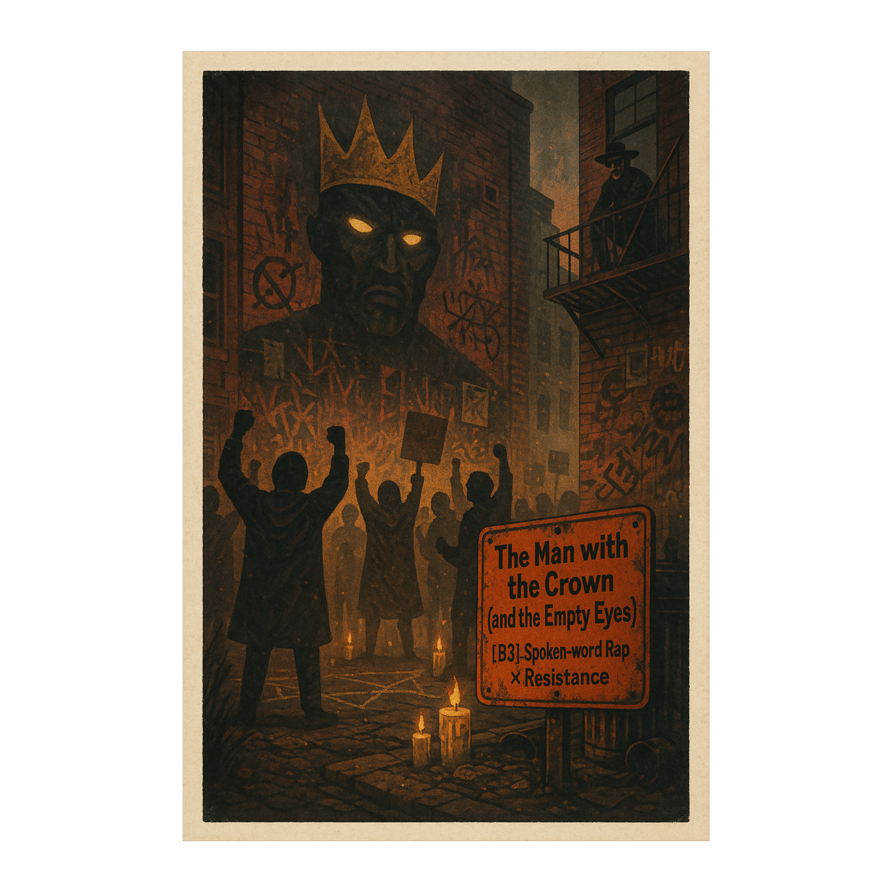 Spoken-word rap with a fusion of retro hip-hop, Turntablism, R&B and modern resistance themes, Lo-fi vinyl textures, dusty piano samples, upright bass grooves, and gritty Ska breakbeats, Add occasional record scratches for vintage atmosphere, Verses delivered with poetic spoken-word cadence, switching into rhythmic modern flow, Include moments of silence and beat dropouts to emphasize certain lines, Use layered vocal call-and-response in the hook, with harmonies or group chants for dramatic effect, Insert adlibs in the background, Mood is politically charged, intelligent, defiant, yet grounded and reflective, Include bass-heavy transitions, occasional brass stabs, and scratching, Ends with fading vocal loop for dramatic close