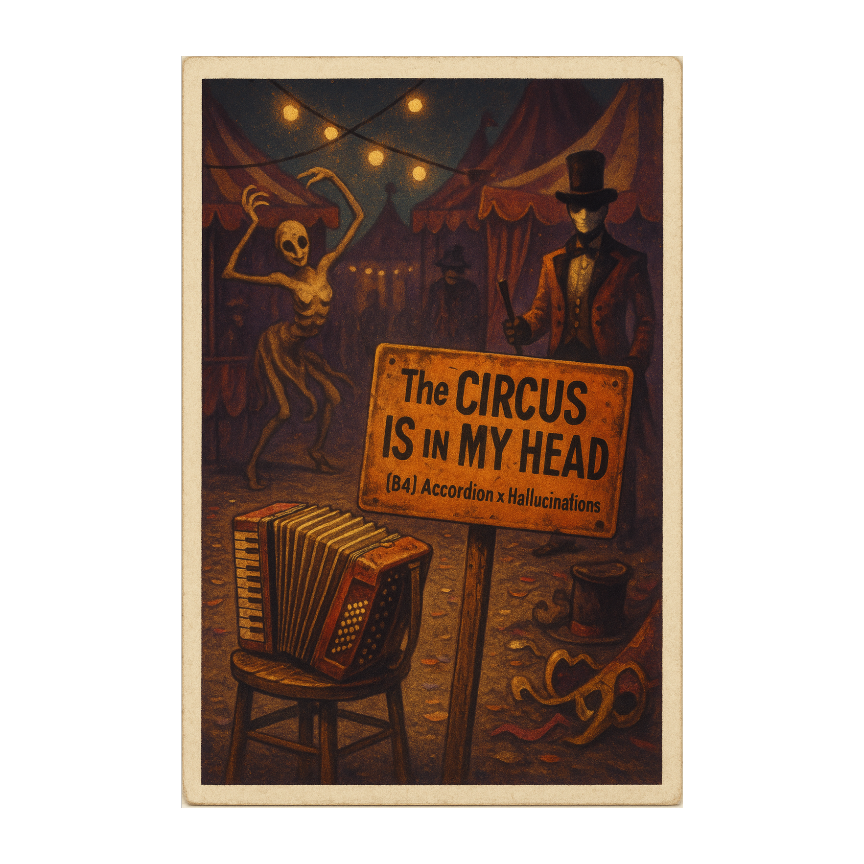 An accordion driven glam pop track with theatrical flair and surreal circus undertones, Fused with hurdy gurdy and bluegrass folk, Use expressive accordion as the main melodic instrument, weaving through a cabaret-inspired waltz rhythm, Combine it with glittery synths, upright bass, and tight glam-style drums with handclaps and floor toms, Verses should feel unhinged and lyrical, with dramatic male vocals, while choruses explode into lush, anthemic glam pop harmonies, Include spoken word in the bridge with ambient textures and a brief musical breakdown, Add subtle psychedelic elements like warped organs, reversed effects, or pitch-shifted whispers, The overall mood is strange, theatrical, ironic, and catchy — like a carnival trapped inside a mirrorball