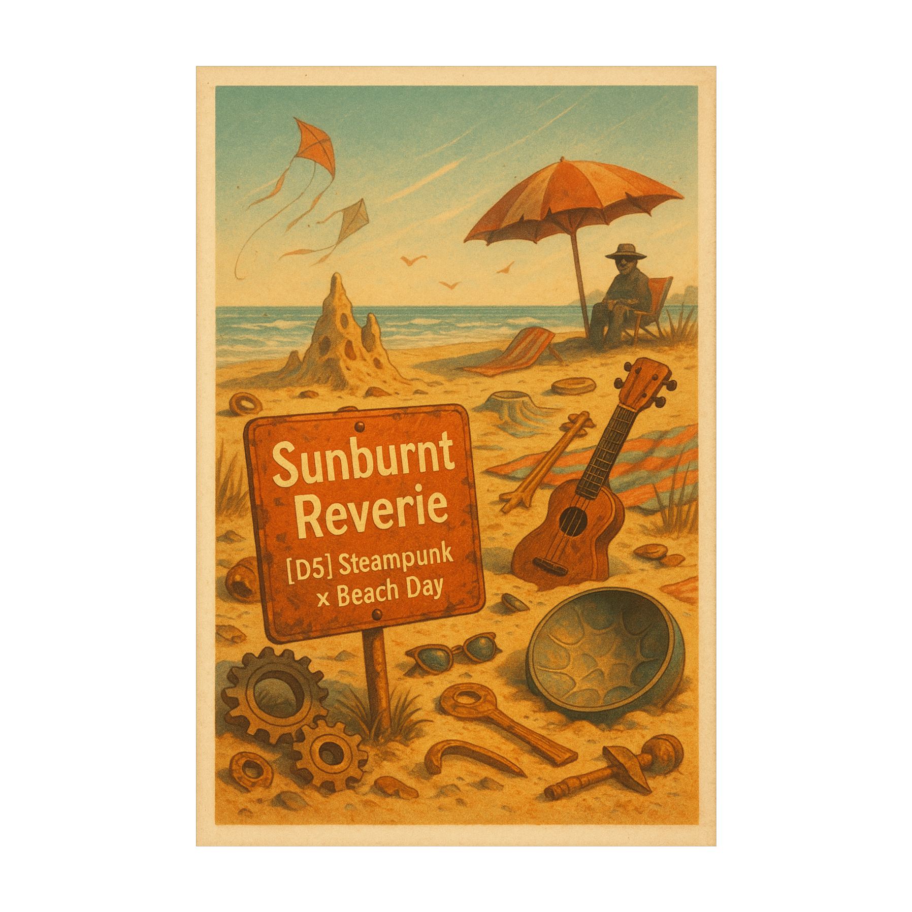 Steampunk-inspired fusion track with tropical, funk and ska elements, Laid-back summer pacing (~98 BPM) with retro, mechanical textures: clockwork percussion, ticking rhythms, hissing valves, and ambient brass layers, Add tropical ukulele strumming and melodic steelpan flourishes for a warm, sun-drenched vibe, Incorporate subtle offbeat ska guitar skanks and brushed swing drums, Use dreamy layered vocals with occasional harmonies and vocables (oohs, ahhs), Lo-fi textures and mechanical ambiance between sections (wind-up toys, creaky gears, reversed waves), Song builds from quiet introspection to lush layered choruses, ending in a non-lexical refrain, Slightly ironic tone — nostalgic, dazed, and surreal