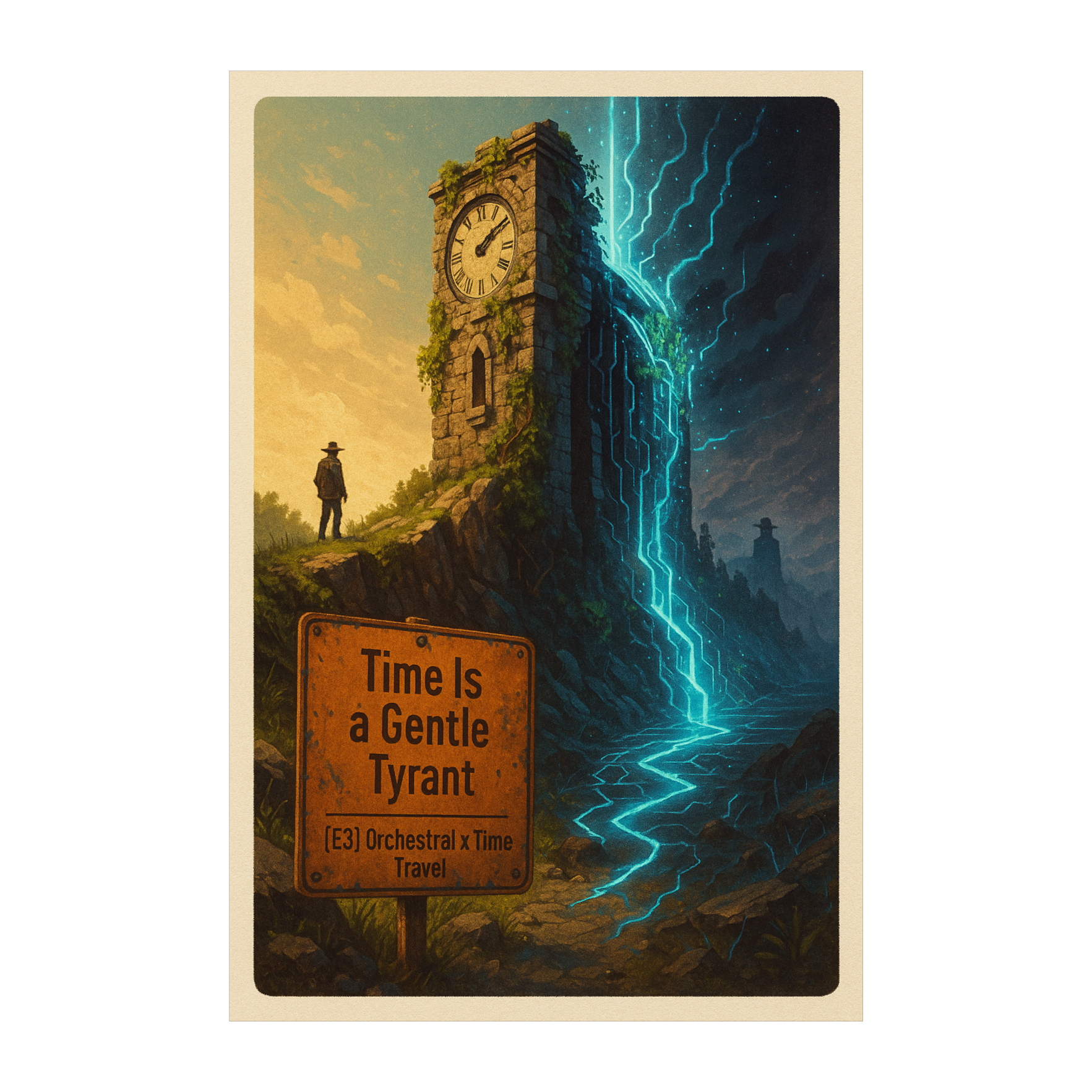 Cinematic fusion of orchestral and electronic music, Mid- to high-tempo with a dramatic, emotional tone, Lush string sections, violins, cello, contrabass, Cinematic percussion, timpani, glockenspiel, Ambient textures merge with electro beats, synth arpeggios, and EDM loops, Builds in intensity with a powerful, layered chorus and choir harmonies, Moody electro pads and ticking clock samples provide a sense of time pressure, Vocals are dynamic and expressive — shifting from soft, theatrical storytelling to soaring, anthemic chorus lines, Include digital echoes, and ambient fade-outs to evoke time distortion, The arrangement is sweeping and evolving, balancing classical grandeur with modern synthetic edge