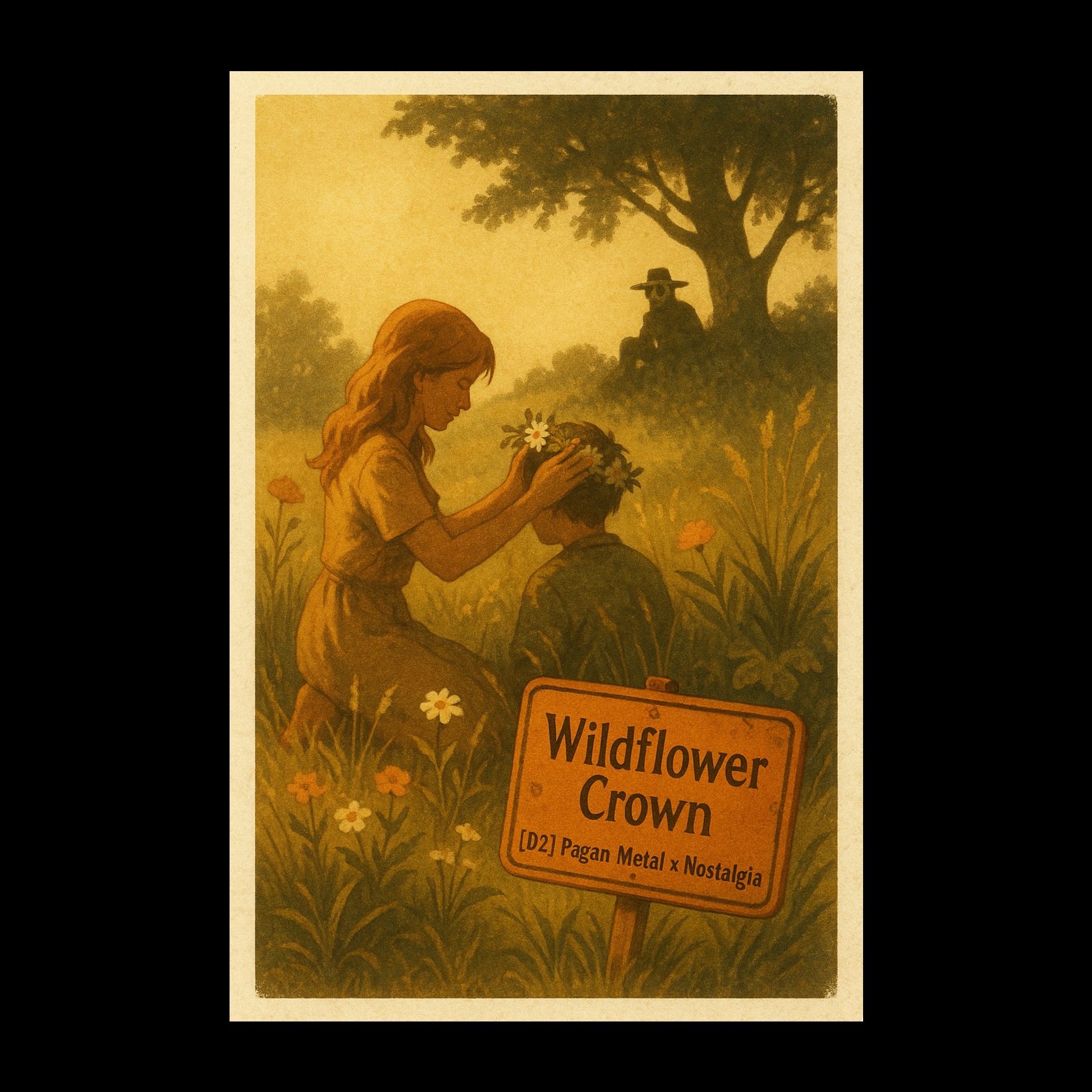 Melodic but heavy pagan metal with a nostalgic and emotional tone, Fused with nu metal and doom metal, Blend acoustic folk instruments like hurdy-gurdy, wooden flute, lyre, and nyckelharpa with layered electric guitars and deep tom-based percussion and syncopated double bass, Verses are atmospheric with ambient textures and subtle harmonies, Choruses should swell with layered vocals, tribal drums, and droning folk instrumentation, Include an instrumental bridge with bagpipe and flute interplay, Vocals: male lead, vide range, expressive and melodic, with light harmonies and occasional whispering, The overall mood is nostalgic, bittersweet, ceremonial, and dreamlike—evoking first love remembered as sacred ritual