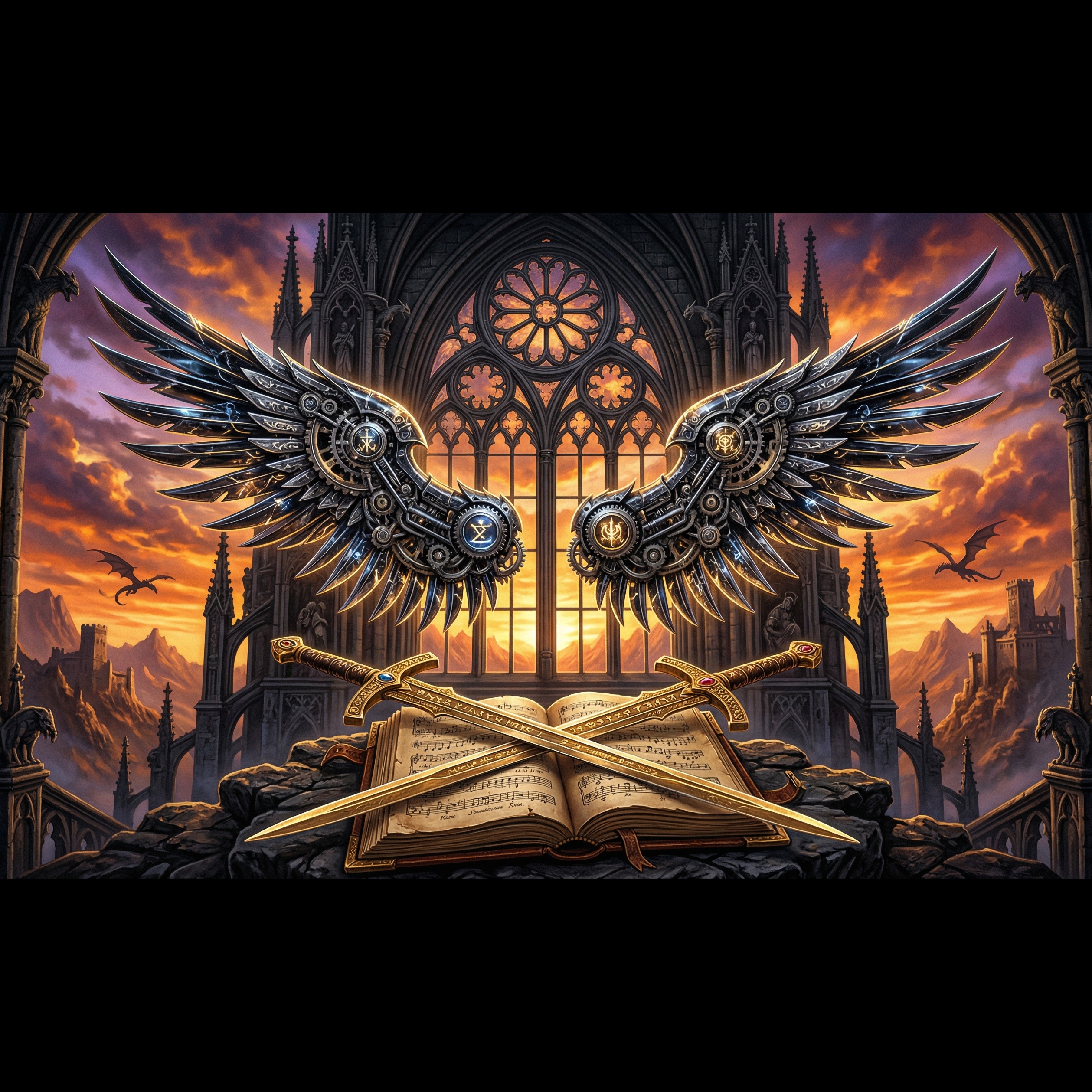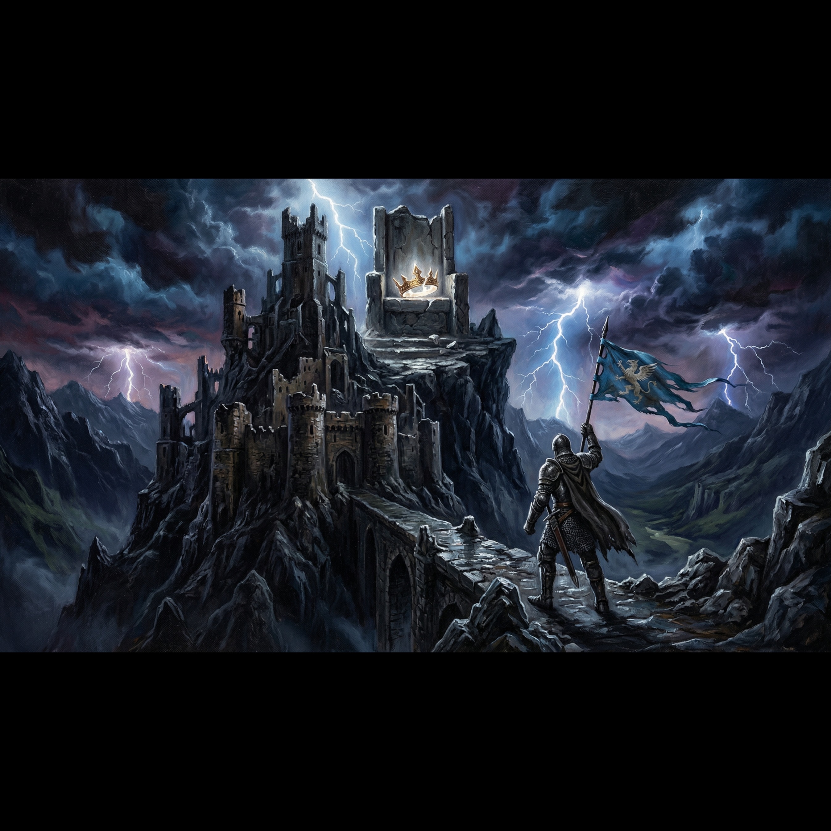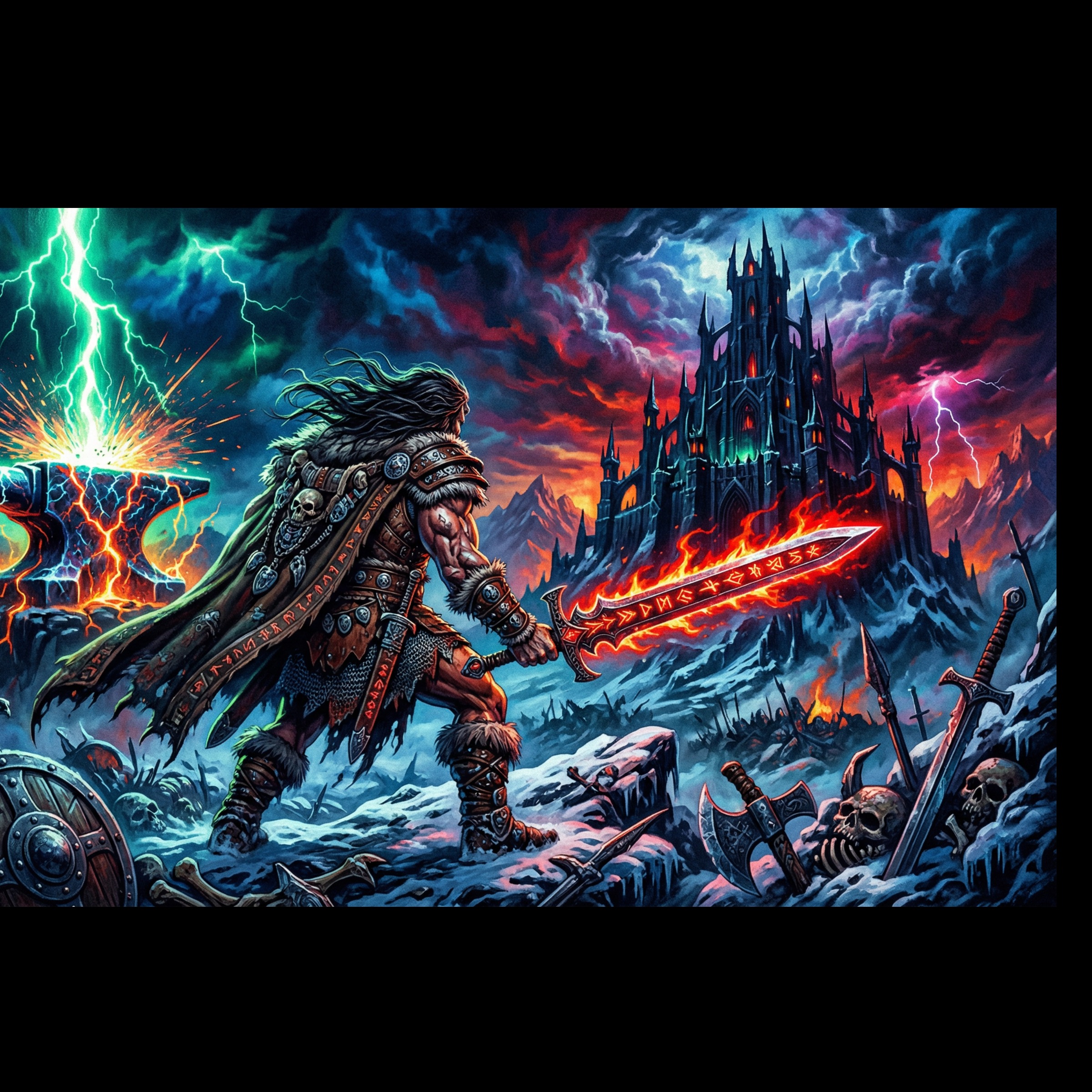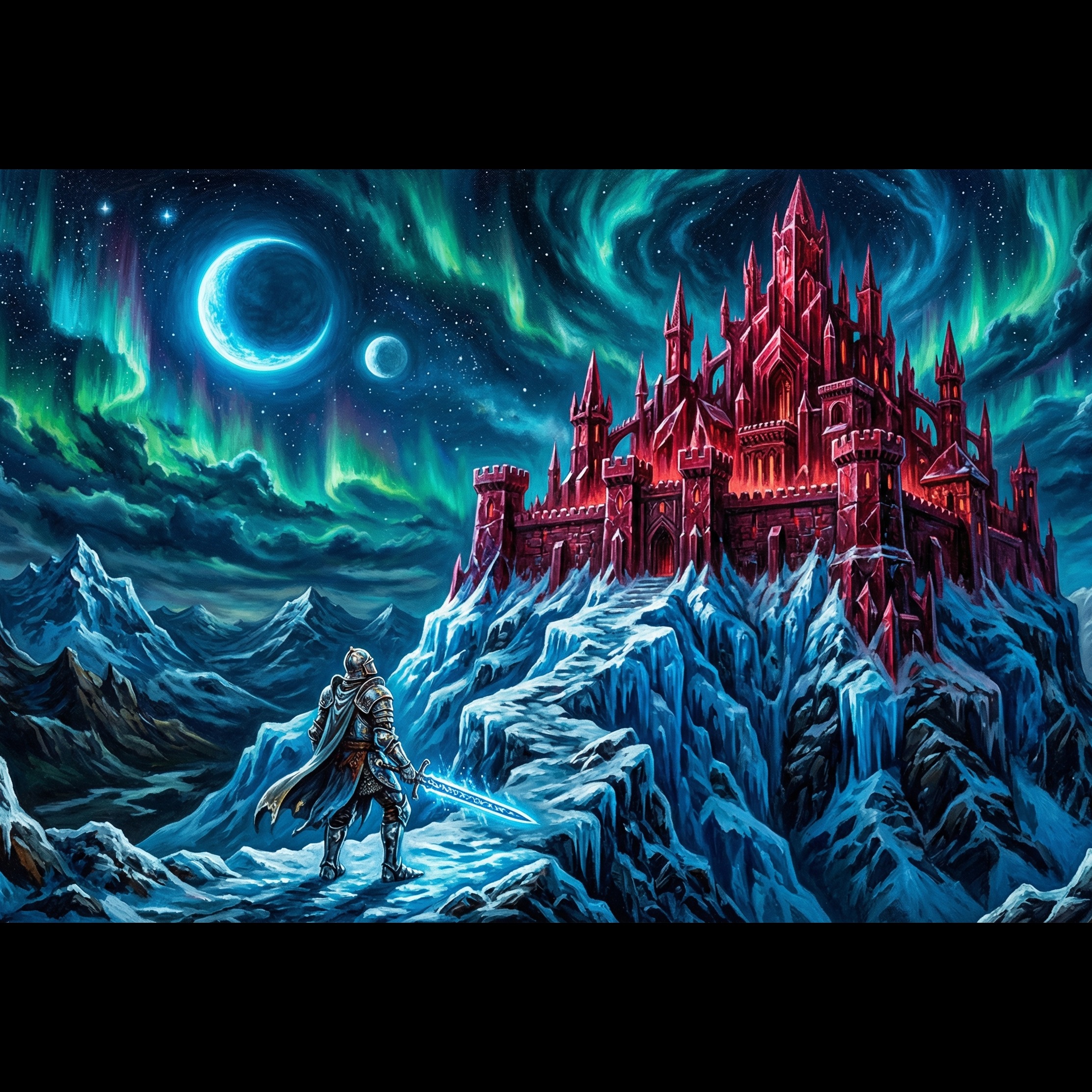 Fast-paced Epic Power Metal, 1990s Italian underground scene, high-technicality and symphonic touches, Instrumentation: Rapid-fire double bass drumming, neoclassical guitar shredding, soaring keyboard fanfares, melodic bass tapping, Vocals: High-pitched operatic tenor, dramatic vibrato, layered epic choirs for the chorus, Structure: Fast opening, complex time signature changes in the bridge, extended dual guitar and keyboard trade-off solos, Tone: F# Minor, 440Hz, Key: F# Minor, Vibe: High fantasy, icy, heroic, relentless, majestic, Keywords: Sword and Sorcery, Elric of Melniboné influence, crystalline production, galloping riffs, virtuous, soaring melodies, Performance: Intense, energetic, soaring vocal delivery, Technical: 175 BPM, bright guitar tone, polished production, massive soundstage, digital-analog hybrid feel