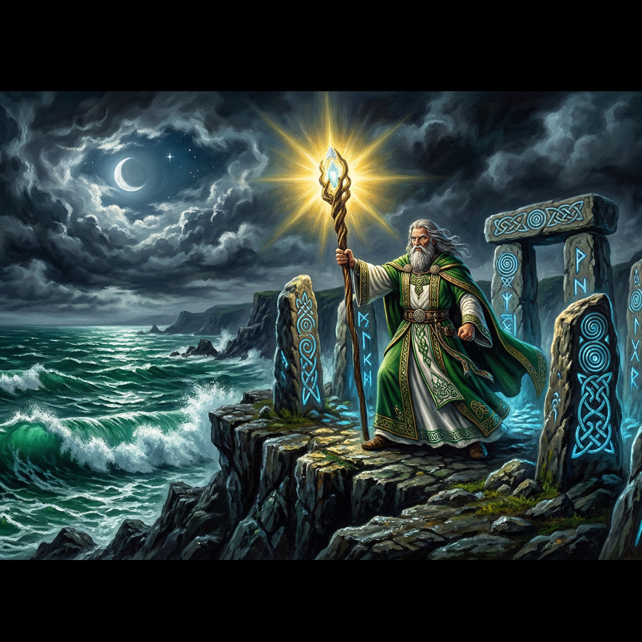High-fidelity Symphonic Folk Metal, late 1990s European style, mystical and energetic, Instrumentation: Heavy distorted rhythm guitars, galloping double-bass drums, prominent celtic folk instruments including uilleann pipes, tin whistle, and frantic folk violin, Orchestral layers: Staccato cellos, cinematic brass, and ethereal harp, Vocals: Charismatic melodic tenor with folk inflections, operatic female soprano backing, massive druidic choir in the chorus, Structure: Atmospheric folk intro, fast-paced metal verses, symphonic bridge with jig-style tempo changes, epic twin guitar and violin duel, Tone: G Minor / D Mixolydian, Key: G Minor, Vibe: Mythological, ancient, vibrant, coastal, forest-dwelling, Keywords: Celtic steel, druidic lore, misty highlands, orchestral folk, 90s production, Technical: 138 BPM, lush production, organic and woodsy sound mixed with metallic crunch