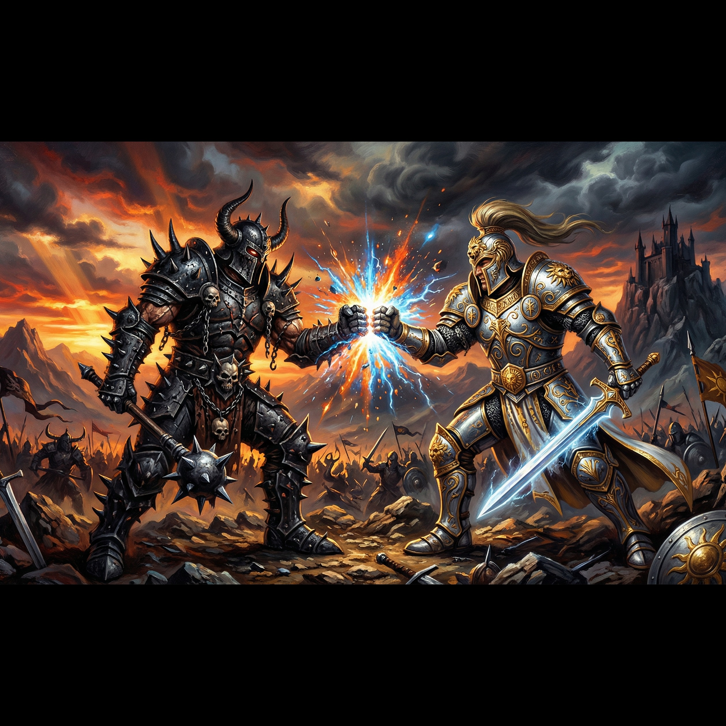 High-fidelity Classic Heavy Metal, 1990s European style, featuring a powerful male vocal duet, Instrumentation: Driving mid-tempo galloping riffs, harmonized twin guitar leads, punchy bass guitar with high-end presence, organic drums with a deep snare, Vocals: A dialogue between two distinct male voices; one a gritty powerful baritone (Voice A) and the other a soaring operatic tenor (Voice B), Constant vocal harmonies and overlapping lines in the chorus, Structure: Melodic guitar intro, verse-verse (alternating voices), shared bridge, massive anthemic chorus with vocal counterpoints, dual guitar solo, Tone: E Minor / B Minor, Key: E Minor, Vibe: Epic, confrontational, heroic, melodic, Keywords: Vocal duel, twin spirits, classic steel, 90s production, anthemic, Technical: 130 BPM, wide stereo vocal panning, crisp and balanced mix