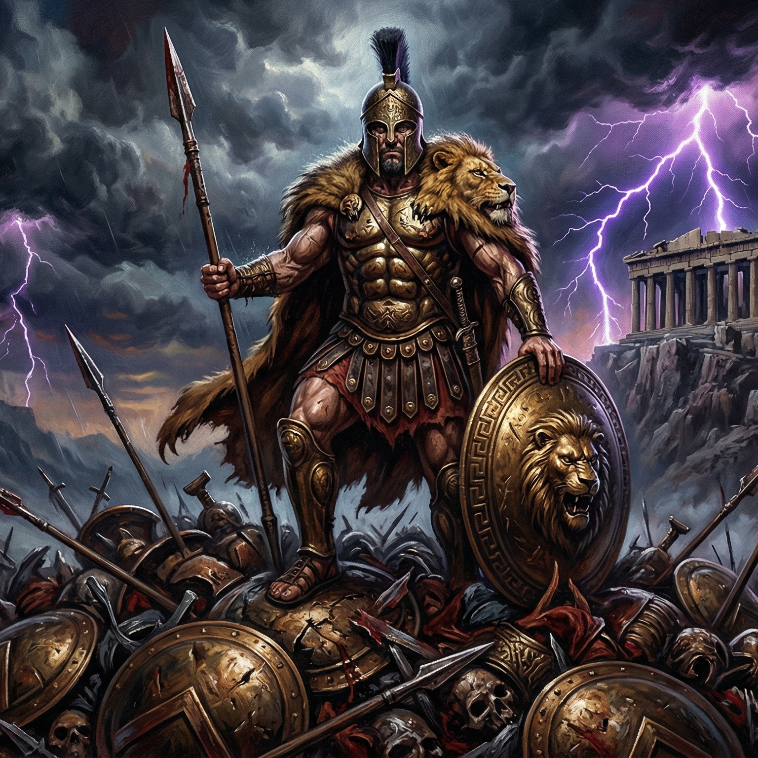 Epic Heavy Metal, 90s European Underground style, high-pitched soaring operatic vocals mixed with gritty mid-range power, galloping drum patterns, dual lead guitar harmonies, analog warmth, thunderous bass presence, complex song structure, no synthesizers, pure steel, Key: E Minor, Tonality: Phrygian Dominant for a dark ancient Greek atmosphere, Tempo: 120 BPM with sudden accelerations, Influences: Battleroar, Wotan, Doomsword, Production: Raw but clear, focusing on the crunch of the rhythm guitars and the resonance of the snare drum, Instrumental bridges with complex neoclassical solos and acoustic interludes for dynamic contrast, The mood is heroic, defiant, and ancient, Full frequency spectrum, high-dynamic range audio, 44, 1kHz fidelity, Strict adherence to traditional heavy metal tropes