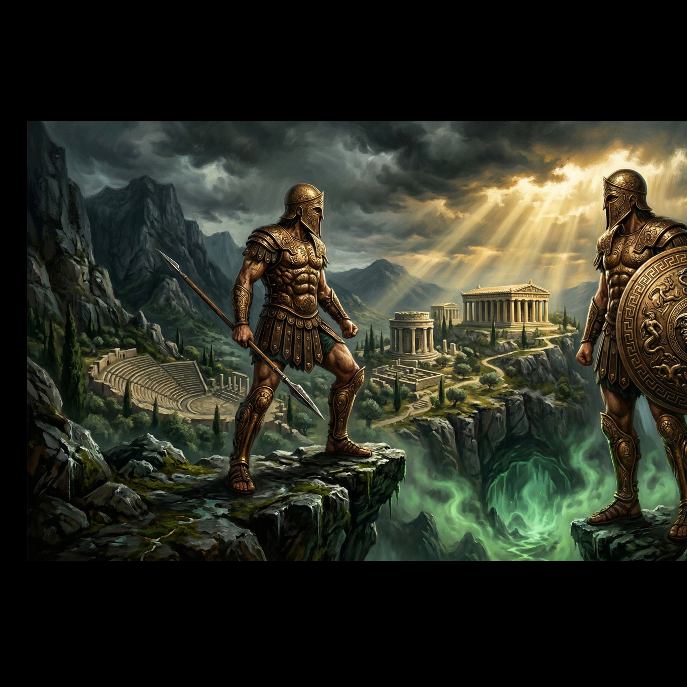 High-fidelity, Epic Heavy Metal, 1990s Greek underground style, heroic atmosphere, booming production, Instrumentation: Galloping iron-clad basslines, massive dual guitar harmonies, thunderous gated reverb drums, soaring masculine tenor vocals with slight vibrato, Structure: Mid-tempo anthem, grand orchestral synth layers in the background, extended neoclassical guitar solos, acoustic 12-string guitar intro, Tone: D Minor, 440Hz, Key: D Minor, Vibe: Mythological, dusty, ancient, powerful, cinematic, Keywords: Valorous, Bronze Age, Sword and Sorcery, Chthonic, Reverb-drenched, Majestic, Performance: Passionate, dramatic delivery, choir backing vocals in the chorus, Technical: 120 BPM, high dynamic range, crisp cymbals, warm tube distortion, analog feel, reminiscent of "Age of Enigma" era