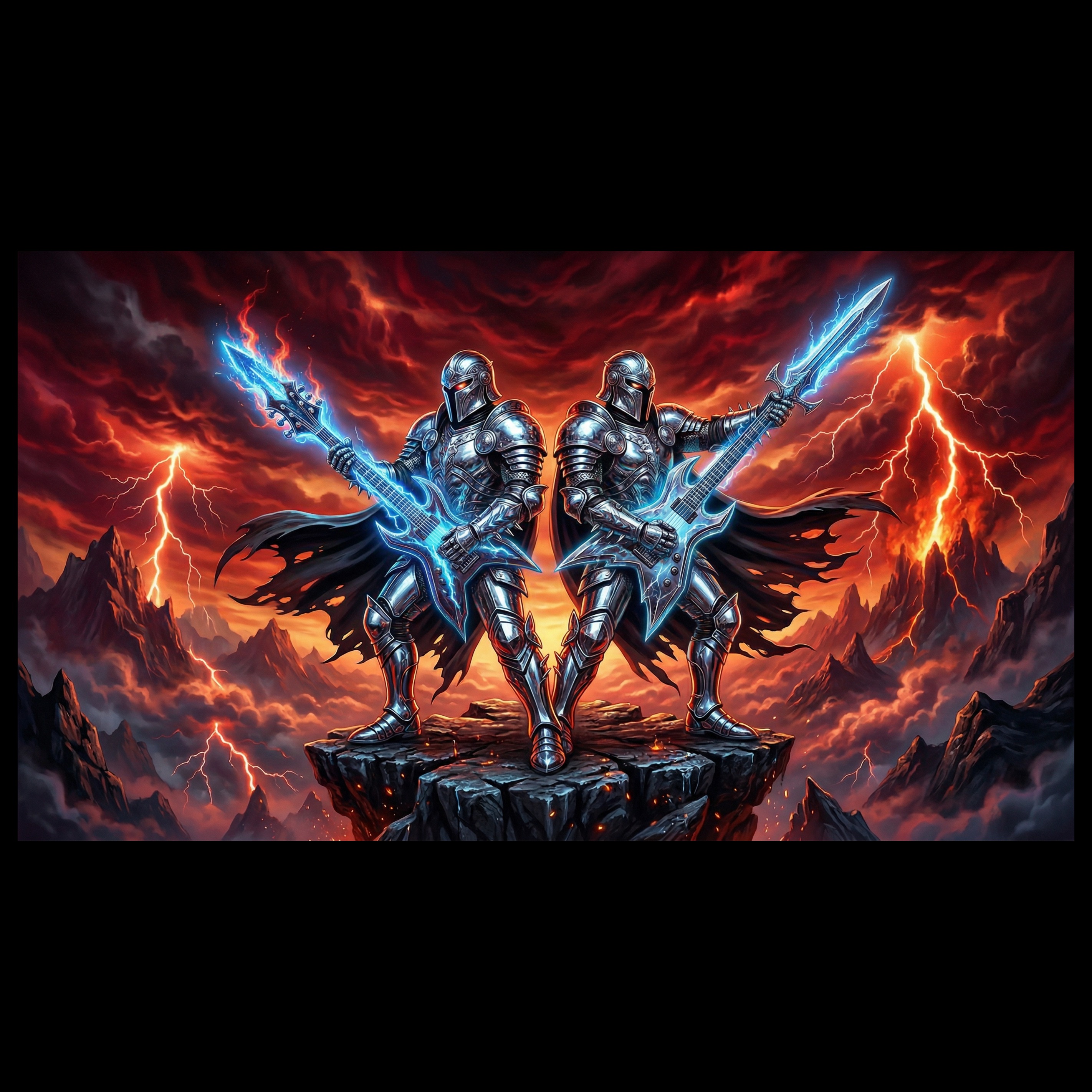 High-fidelity Classic Heavy Metal, 1990s European revival style, high-energy and melodic, Instrumentation: Constant harmonized twin guitar leads in 3rds and 6ths, rapid galloping rhythm guitar, clanking mid-forward bass guitar, punchy organic drums with a crisp snare and heavy crash cymbals, Vocals: Clean, powerful melodic tenor with high-register soaring peaks, massive "stadium-style" backing vocals for the chorus, Structure: Epic harmonized guitar intro, verse with chugging riffs, melodic pre-chorus, anthemic chorus, extended twin guitar trade-off solos followed by a unison harmony section, Tone: E Major / F# Minor, Key: F# Minor, Vibe: Heroic, fast, rebellious, bright, metallic, Keywords: Guitar harmonies, galloping riffs, Teutonic steel, melodic mastery, leather and studs, 90s production, Technical: 145 BPM, biting guitar tone, clear and loud production, analog warmth