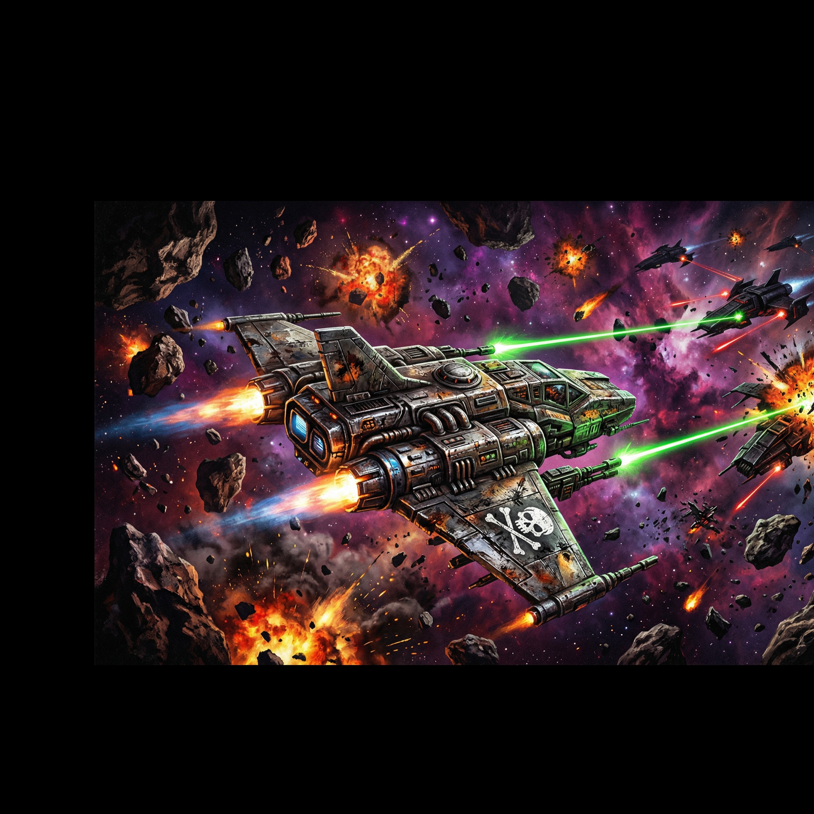 High-fidelity NWOBHM with Speed Metal energy, late 1990s style, raw and aggressive with a space war theme, Instrumentation: Overdriven "cranked Marshall" rhythm guitars, biting bridge pickup tone, galloping double-bass drums, prominent "Steve Harris" clanking finger-style bass guitar, no synthesizers, Vocals: Gritty, mid-range "biker-style" male vocals, shouting delivery, multi-tracked "gang-vocal" choruses like a football chant, Structure: Relentless galloping riffs, verse-bridge-chorus-verse, short aggressive pentatonic guitar solos with wah-wah and dive bombs, Tone: A Minor / D# Minor, Key: A Minor, Vibe: Dirty, warlike, mechanical, intense, high-octane, Keywords: Biker metal in space, space cavalry, NWOBHM revival, aggressive melody, raw production, Technical: 158 BPM, dry vocal mix, minimal reverb, loud and punchy drums, analog warmth