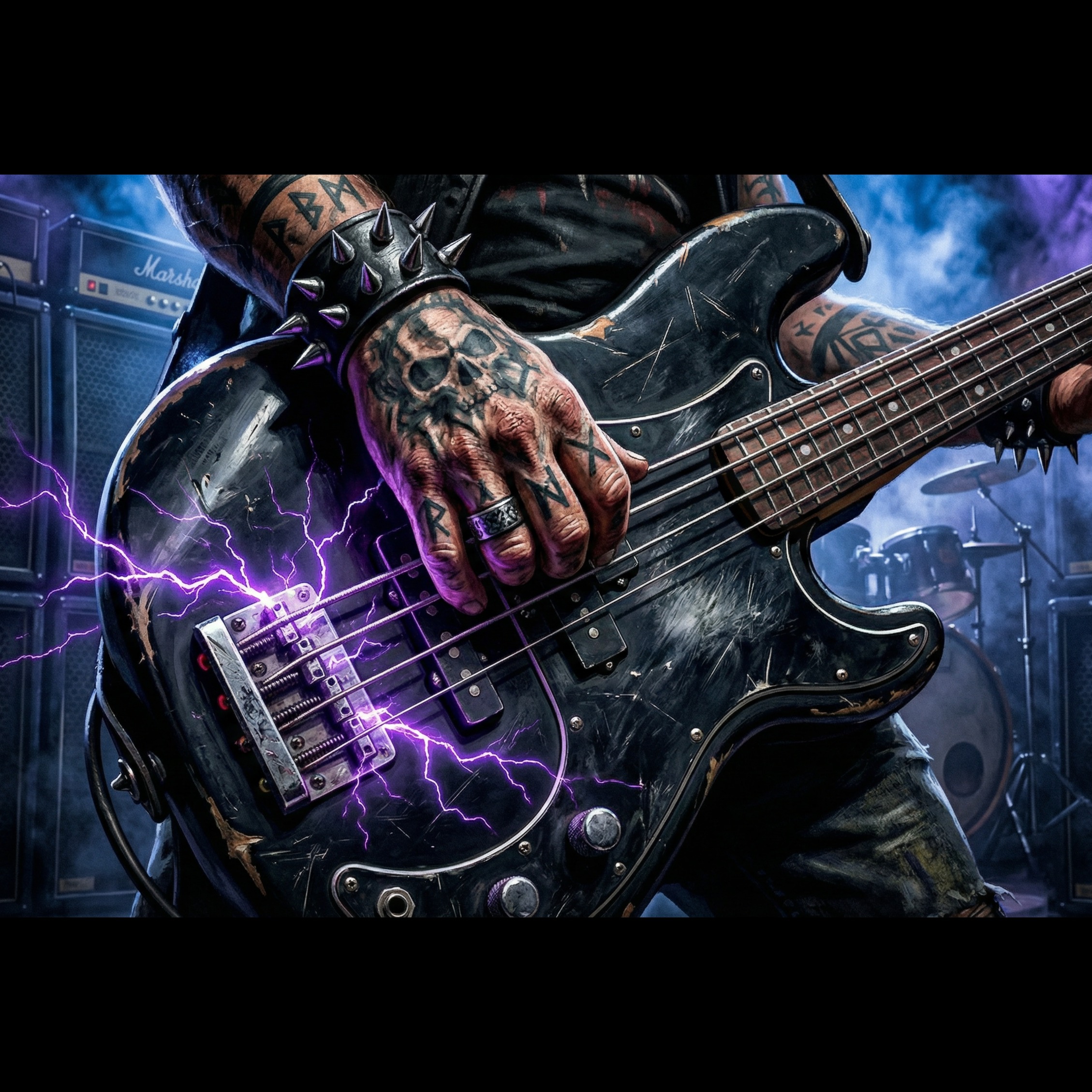 High-fidelity True Heavy Metal, 1990s European underground style, prominent bass-driven composition, Instrumentation: Clanking, distorted high-mid bass guitar with heavy finger-style attack, galloping "triplet" rhythm guitars, punchy organic drums with a dry snare, melodic twin guitar leads, Vocals: Masculine, powerful mid-range baritone, transitioning to high-pitched operatic screams, group "gang-vocals" for the chorus, Structure: Bass solo intro, fast galloping verse, rhythmic bridge with bass-and-drum breakdown, anthemic chorus, technical guitar solo with bass counterpoint, Tone: E Minor / A Minor, Key: E Minor, Vibe: Rebellious, dark, heroic, mechanical, rhythmic, Keywords: Bass-driven, galloping riffs, Teutonic steel, iron-clad rhythm, 90s underground, organic production, Technical: 144 BPM, bass guitar sitting high in the mix, biting guitar tone, clear and loud mastering