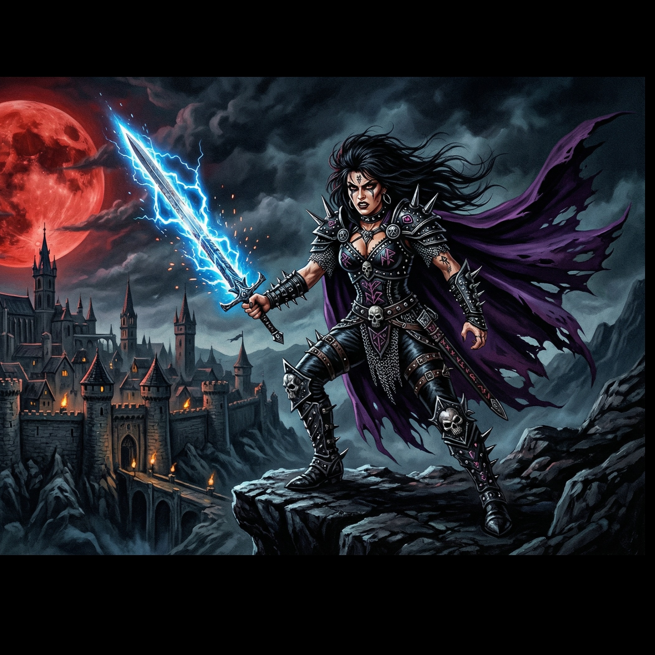 Traditional Heavy Metal, Female Fronted, 1980s-90s revival, high energy, aggressive but melodic, Instrumentation: Fast double-kick drumming, shredding pentatonic guitar solos, clanking "Steve Harris" style bass, occult organ accents, Vocals: Powerful female belts, raspy mid-range, operatic high screams, multi-layered harmonies, Tone: E Minor, Key: E Minor, Vibe: Witchcraft, nocturnal, sharp, energetic, classic, Keywords: Polish Metal scene, NWOBHM influence, speed metal energy, dark fantasy, leather and spikes, analog warmth, Structure: Fast-paced, bridge with tempo change, melodic outro, Technical: 145 BPM, biting guitar tone, clear vocal production, punchy snare, massive hall reverb on solos, Style: Melodic, dark, soaring, rebellious, authentic heavy metal spirit