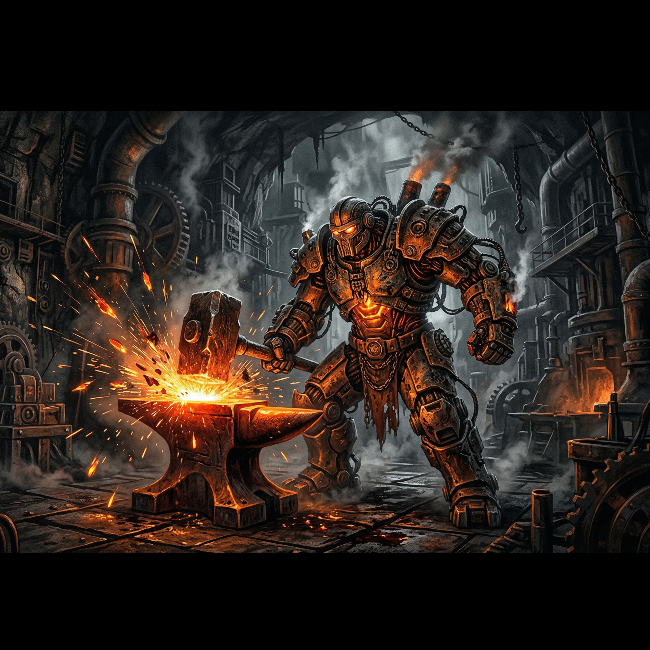 High-fidelity Heavy Metal, 1990s underground style, aggressive galloping rhythm and heavy percussion, Instrumentation: Sharp palm-muted guitar "chugging" in triplets, extremely loud and punchy double-bass drumming, clicking "Steve Harris" style bass tone, minimal industrial synth textures, Vocals: Powerful mid-range with aggressive raspy delivery, rhythmic vocal patterns, massive shout-along "gang" choruses, Structure: Percussive drum intro, relentless galloping verse, building bridge, thunderous anthemic chorus, rhythmic guitar solo with heavy wah-wah, Tone: E Minor / D# Minor, Key: E Minor, Vibe: Industrial, warlike, mechanical, relentless, powerful, Keywords: Galloping riffs, thunderous drums, iron and steam, rhythmic precision, 90s production, Technical: 130 BPM, high compression on drums, biting guitar attack, very prominent snare