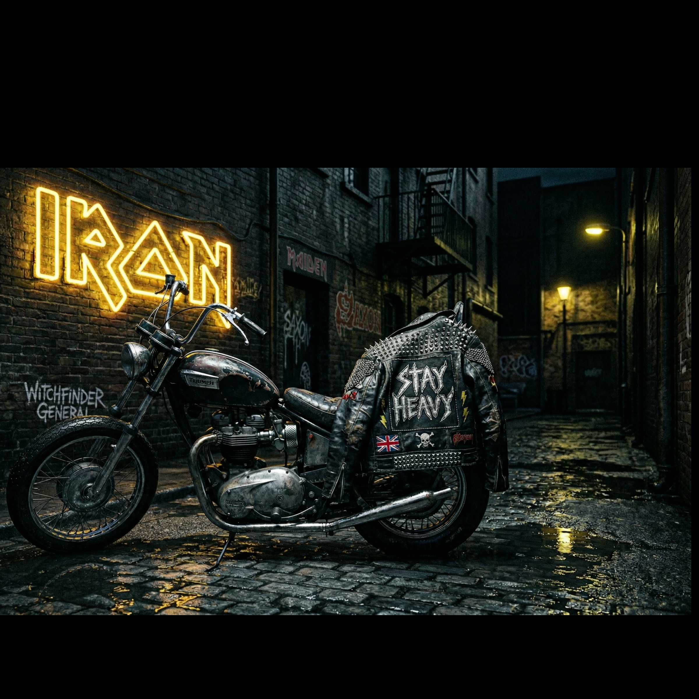 Authentic NWOBHM style, 1990s revival aesthetic, raw and energetic Heavy Metal, Instrumentation: Overdriven "cranked Marshall" guitar tone, biting bridge pickup riffs, galloping bass lines with high treble clank, punchy open-sounding drums with heavy hi-hat work, Vocals: Gritty, mid-range "working class" male vocals, street-wise delivery, energetic shouts, gang-vocal choruses, Structure: Fast riff-driven intro, verse-bridge-chorus-verse, short aggressive guitar solos with wah-wah and pentatonic scales, high-octane outro, Tone: A Major, Key: A Major, Vibe: Dirty, rebellious, high-speed, urban, petrol-fueled, Keywords: Biker metal, 70s/80s British influence, raw production, street level, leather and studs, denim, analog grit, Technical: 148 BPM, dry vocal production, minimal reverb, loud guitars, punchy master, Performance: Aggressive, raw, and unpolished