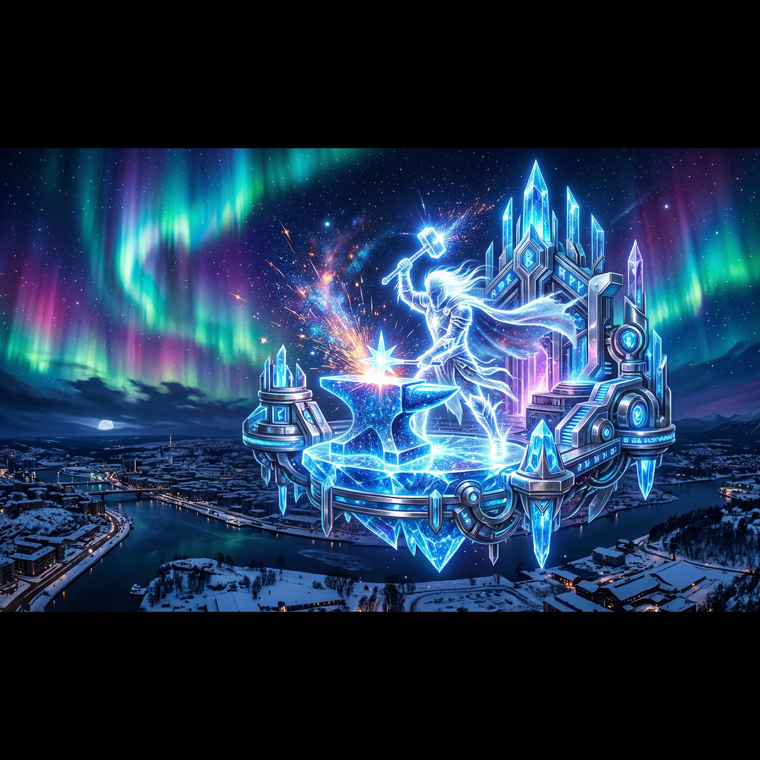 High-fidelity Swedish Heavy/Power Metal, late 1990s-2000s style, transcendent and high-energy, Instrumentation: Razor-sharp synchronized guitar riffs, rapid double-bass drumming with high-end click, melodic clanking bass, bright neoclassical synthesizer accents, Vocals: Extraordinary high-pitched power metal tenor, glass-shattering screams, wide-interval vocal runs, heroic layered harmonies in the chorus, Structure: Fast technical intro, palm-muted galloping verse, soaring pre-chorus, massive anthemic chorus, long virtuous guitar solo with neoclassical arpeggios, Tone: E Minor / G Major, Key: E Minor, Vibe: Ascending, heroic, icy but burning, philosophical, triumphant, Keywords: Swedish steel, transcendent metal, soaring vocals, Gothenburg sound, crystalline production, Technical: 155 BPM, ultra-clean production, high-gain guitars, massive reverb on vocals