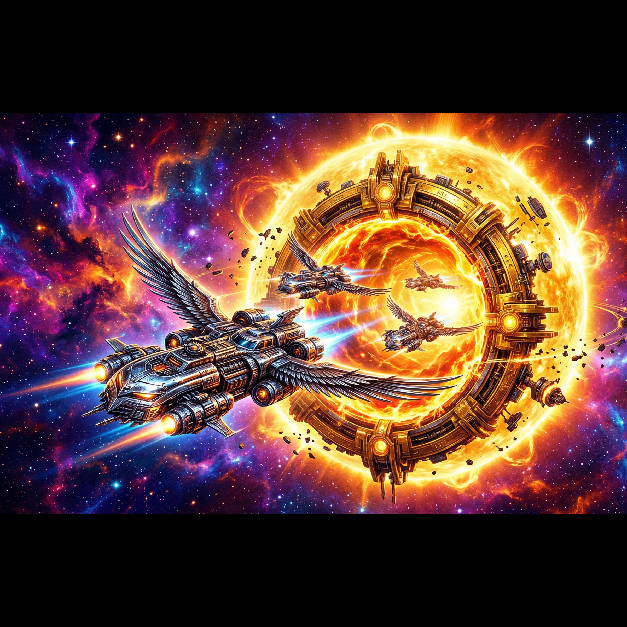 High-speed German Power Metal, late 1990s style, melodic and triumphant, Instrumentation: Rapid-fire double-bass drumming, galloping 16th-note guitar riffs, bright analog synth pads, clanking melodic bass, Vocals: High-pitched melodic tenor with powerful rasp, soaring anthemic choruses with massive "choir-style" multi-tracked harmonies, Structure: Fast melodic guitar intro, energetic verses, building pre-chorus, explosive triumphant chorus, long technical guitar solos with neoclassical and blues-rock influences, Tone: E Major / F# Minor, Key: E Minor, Vibe: Uplifting, heroic, sci-fi, fast, rebellious, Keywords: Teutonic steel, solar journey, speed metal, freedom, 90s production, Kai Hansen style, Technical: 175 BPM, polished and bright production, high-energy delivery