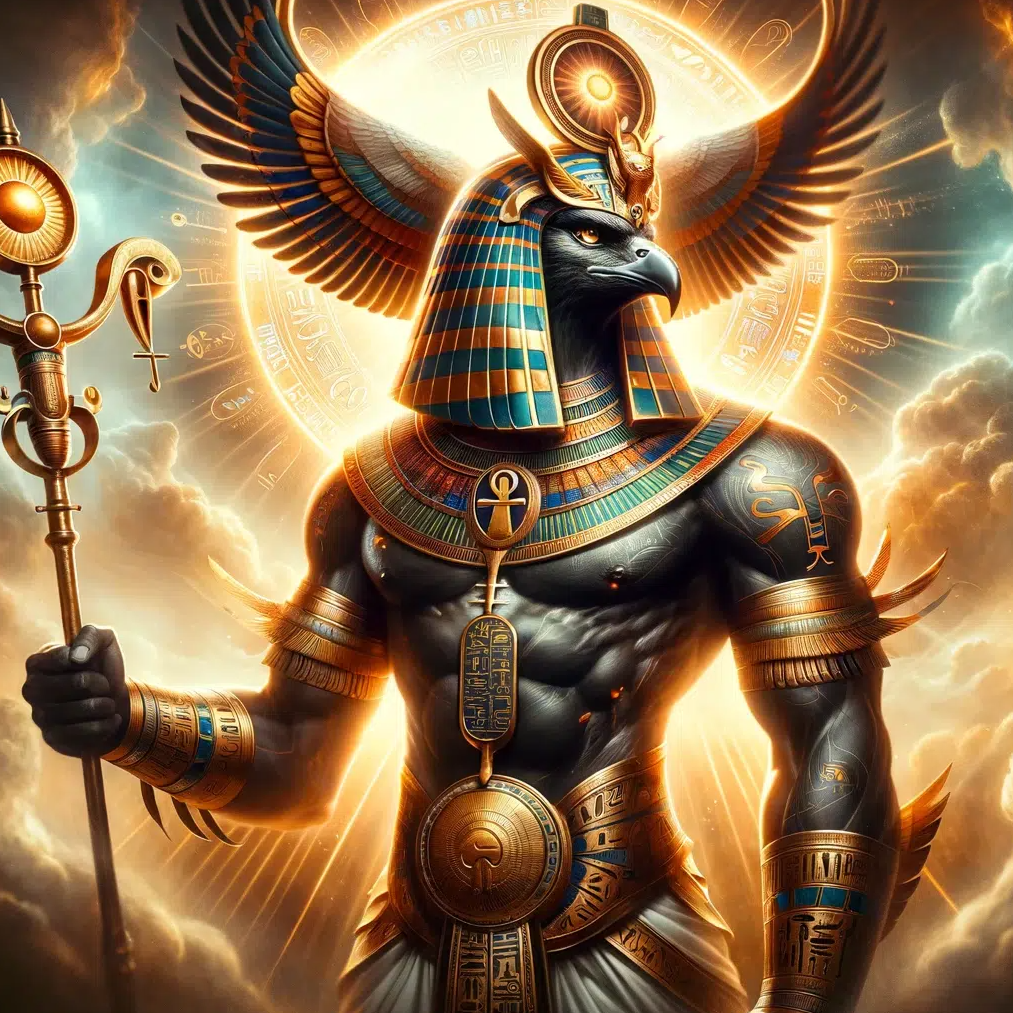 Compose a triumphant power metal anthem inspired by Ra, the Egyptian sun god, Open with Egyptian temple ambiance — desert wind, sistrum rattles, and rising oud or ney (reed flute) melody, Introduce a galloping rhythm at 130–140 BPM with heroic guitar riffs using harmonic minor and Phrygian dominant scales to evoke Middle Eastern/Egyptian tonality, Layer bombastic drums and warlike snare rolls that mimic the march of Ra’s solar barque, Lead vocals must be bold and divine — sung like commands from a radiant god — while choirs echo ancient hymns (use chants like "Ra Akhet" or "Kheperu Sekhem"), Add layers of darbuka percussion and string stabs to mimic battle against Apophis, Include a mid-song instrumental break with distorted oud/sitar and blazing guitar solo to reflect the night’s chaos, End with rising chorus, echoing drums, and a final bright note — as if the sun is rising anew