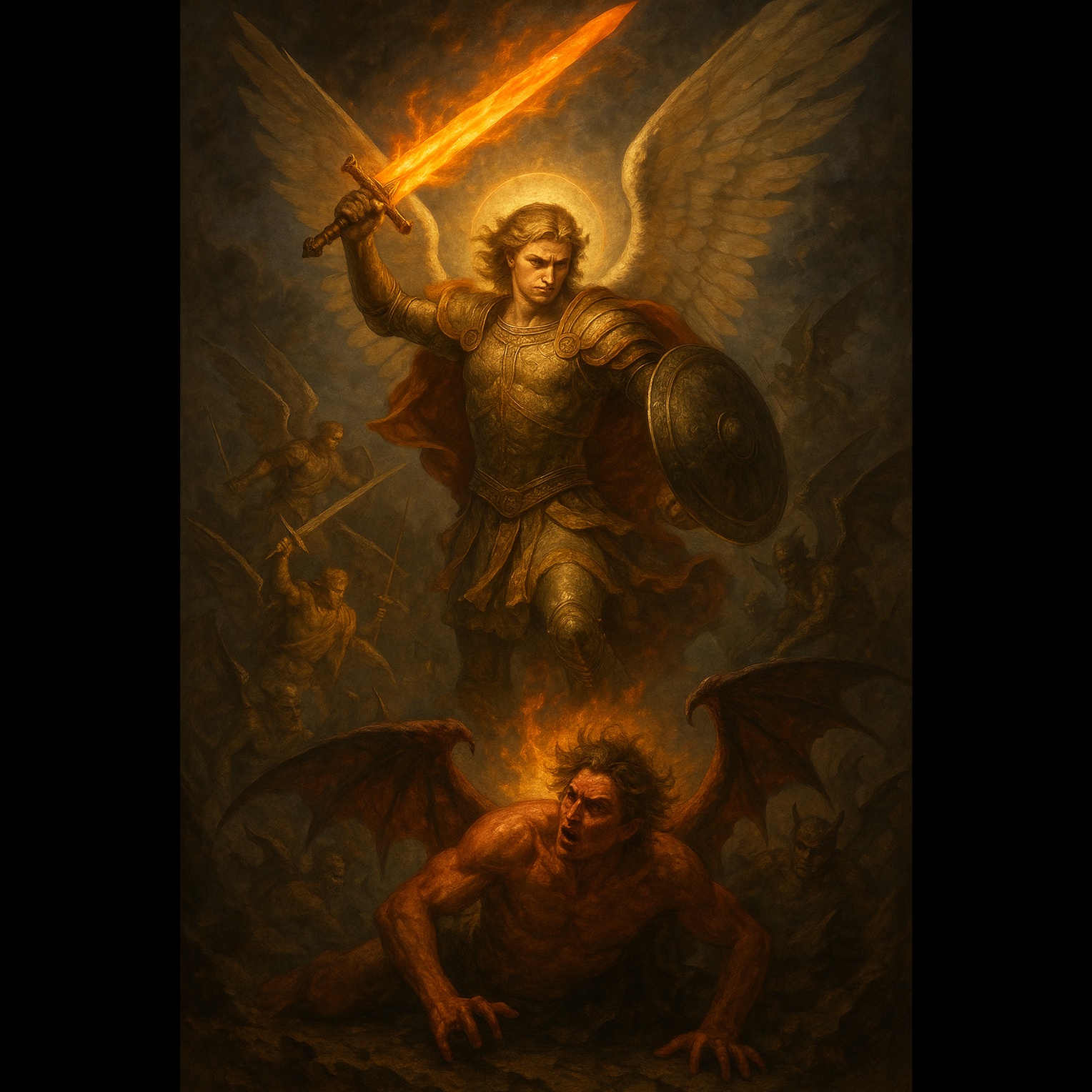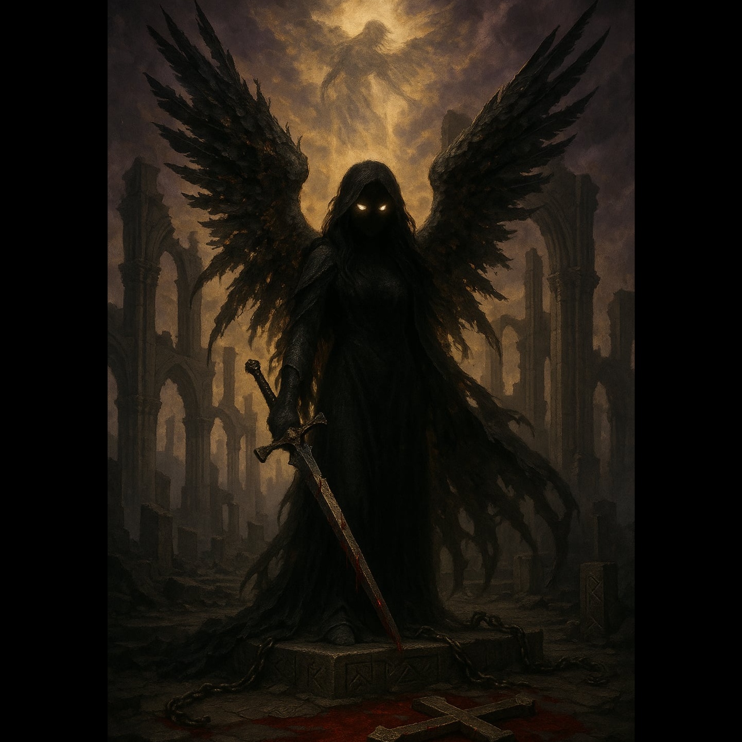 Create a dramatic, dark power metal anthem at ~105 BPM, Use solemn pipe organ, deep Latin chants, thunderous drums, and heavy rhythm guitars to evoke a gothic, ecclesiastical tone, Start with ominous choir and church bell tolls, Verses should be slow and rhythmic with powerful, sermon-like vocals, Pre-choruses rise with Latin lines and layered choral tension, Choruses must explode with divine wrath—soaring lead vocals, epic choral backing, and punchy, memorable hooks, Add a bridge with Gregorian chants over organ before transitioning to a melodic, sinister guitar solo, End with Latin whispers, bells, and thunder to reflect Lucifer’s fall from holy grace, The atmosphere should feel like a dark mass echoing across a ruined heaven