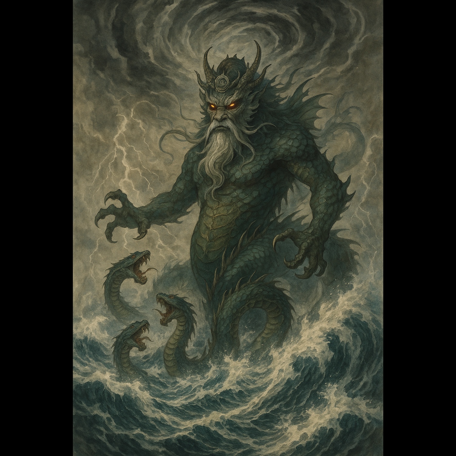 Compose a power metal anthem at ~140 BPM inspired by Ryūjin, the dragon god of the sea, Begin with stormy wave SFX, orchestral build-up, and a haunting shakuhachi flute line, Guitars crash in like tidal waves, supported by double-kick drums and oceanic symphonic textures, Verses are dark and mysterious, telling of Ryūjin's slumber and fury, Pre-choruses build tension with layered synths and choral harmonies, Choruses explode with aquatic power—anthemic, vast, and dangerous, Incorporate a melodic solo with Far Eastern motifs and crashing wave percussion, The mood should feel massive, ancient, and fluid—invoking the sea’s wrath and the majesty of a dragon god