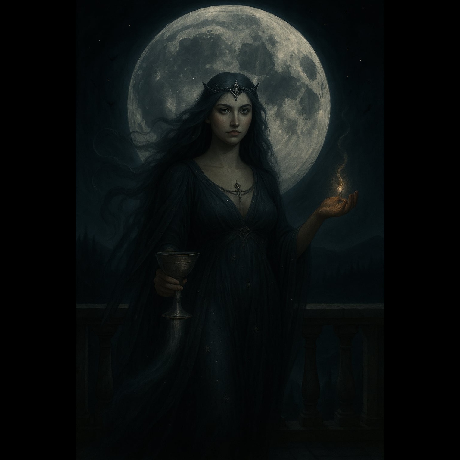 Compose an epic, atmospheric power metal ballad that blends haunting beauty with symphonic power, Begin with soft piano, ethereal choirs, and shimmering guitar arpeggios to evoke the stillness of night, Verses should flow like moonlight — graceful, poetic, and sorrowful — with a moderate tempo and clear, emotional vocals, Pre-choruses rise like a dream turning to memory, and choruses should burst into orchestral power with layered choirs, sustained chords, and melodic leads, Add subtle harp, bells, or strings for a divine celestial feel, The bridge should feature a haunting piano and whispering wind textures, building into a powerful solo that soars like a goddess in flight, The final chorus must be majestic yet melancholy, fading into a dreamy outro with choir and soft wind, Think moonlight turned into music