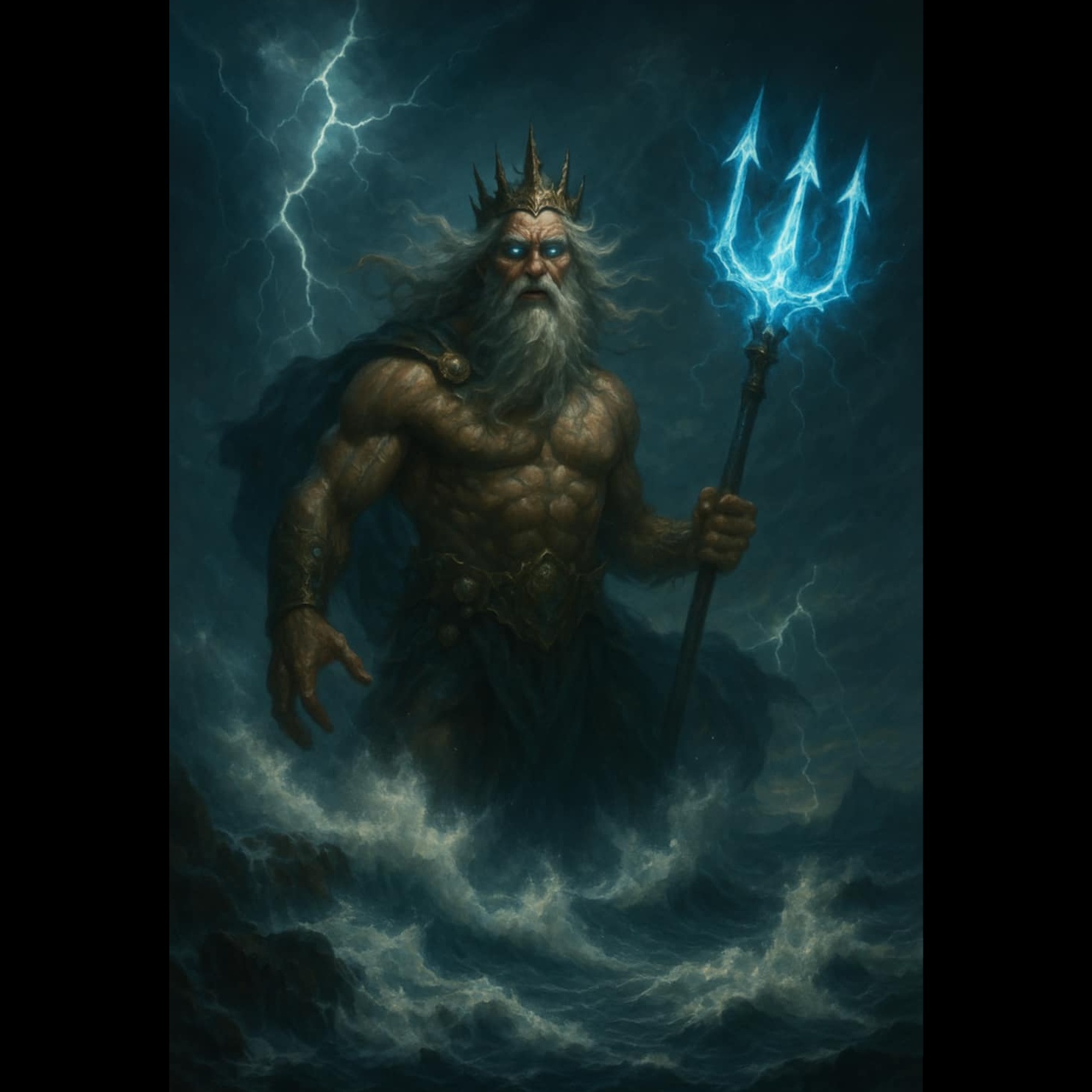 Compose an epic power metal anthem invoking the wrath and majesty of Poseidon, Begin with crashing waves, tolling bells, and a foreboding organ riff to establish mythic grandeur, Guitars should thunder like tectonic plates, with a galloping rhythm echoing chariots over stormy tides, Incorporate Phrygian and Dorian modes to evoke ancient Mediterranean drama, Use choral elements with deep male voices chanting Greek-sounding syllables, Choruses should explode with orchestral brass, layered choirs, and anthemic melodies celebrating Poseidon's might, Add oceanic sound design — harpoons clashing, kraken roars, and deep reverb — to immerse listeners in his abyss, Close the song with a fading wave and whispering thunder, like a god retreating into silence