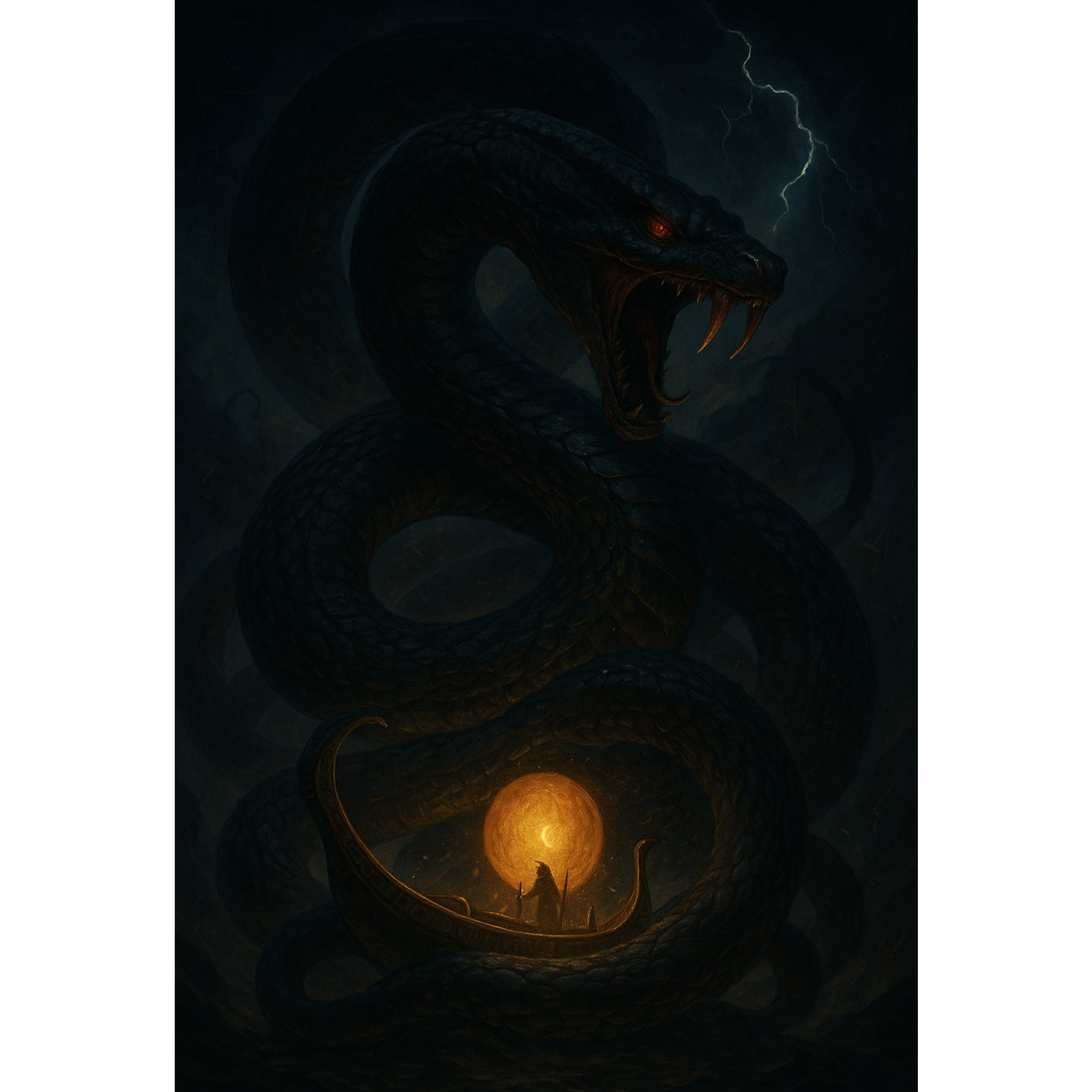 Compose a dark, mid-tempo power metal anthem centered on Apophis, the Egyptian serpent of chaos, Begin with ominous desert wind, distant thunder, and slow, hypnotic oud or sistrum patterns in Phrygian dominant scale, Set a slithering pace (≈90–110 BPM) with heavy palm-muted riffs, minor key arpeggios, and deep floor toms that pulse like a heartbeat in the underworld, Lead vocals should be commanding and grim, with whispered verses and roaring choruses, supported by monk-like choirs or layered chants (“Apophis! Apophis!”) to invoke dread, Use dissonant, droning synths behind choruses for a cosmic void-like feel, Guitar leads should mimic serpent movements — slow bends, sliding trills, and sudden bursts of speed, Introduce breaks with ritual percussion, ancient-sounding chants, and serpentine solos, End with a descending chromatic riff, fading wind, and final drumbeat — as if the world blinked and darkness whispered its return