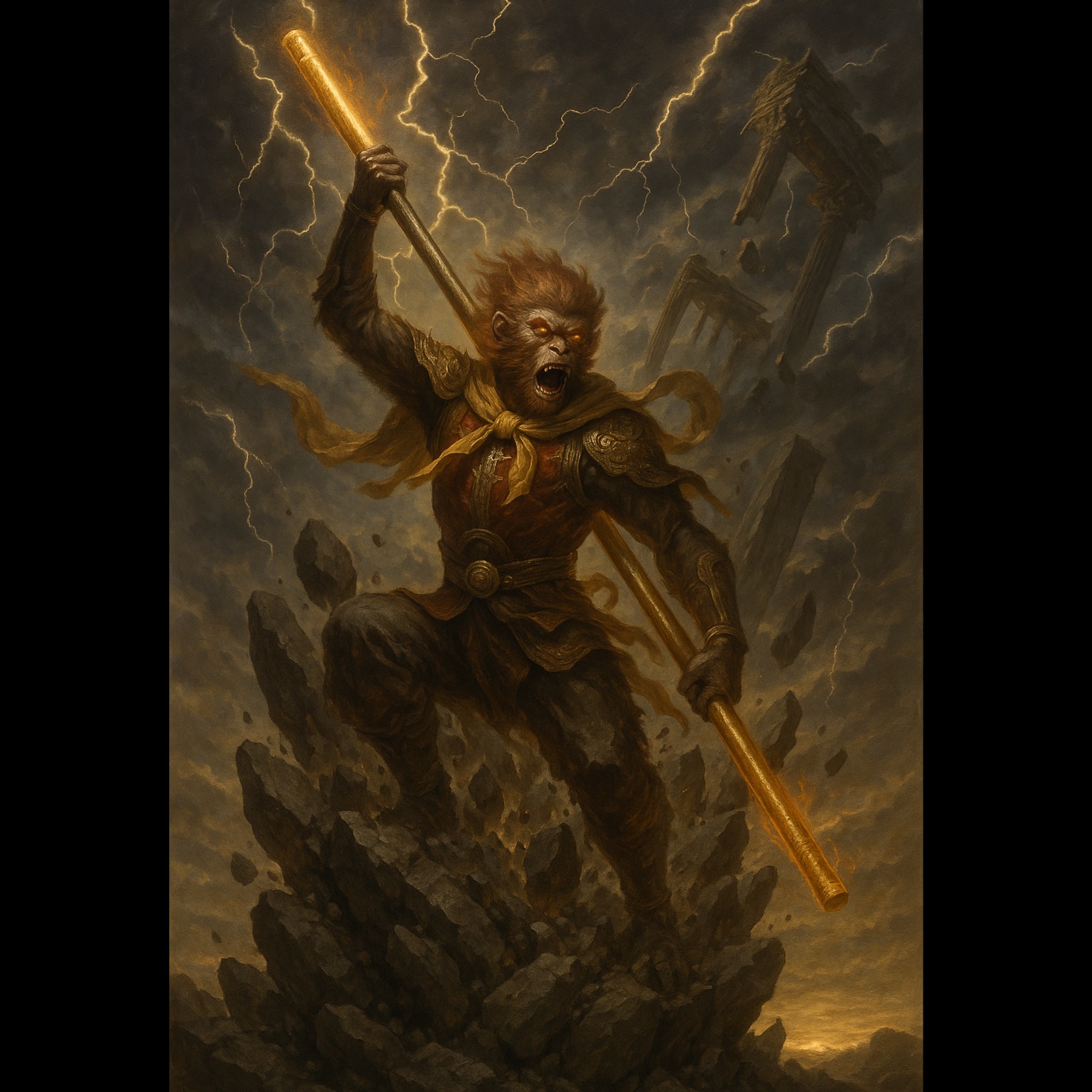 Compose a fast, explosive power metal anthem inspired by Sun Wukong, the Monkey King, Begin with Chinese temple bells, light guzheng or erhu melodies, and thunderous taiko-style war drums, Launch into high-speed double-bass drumming (≈160–180 BPM), galloping guitars in exotic Eastern scales (double harmonic, Lydian ♯2), and roaring vocals full of fiery charisma, Verses should be quick, dynamic, and rebellious, while choruses are soaring, catchy, and godlike — each one distinct, built like declarations of war against Heaven, Use call-and-response group chants (“Heavenbreaker!”) and heroic leads to create mythic momentum, Mid-song solo should blend electric guitar with Chinese pentatonic phrases or mimic erhu bends for flair, Add a bridge with thunder, distorted chants, and a brief ritualistic interlude before returning to final chorus, End on a massive drum hit and fading wind, like the Monkey King leaping beyond the clouds once more