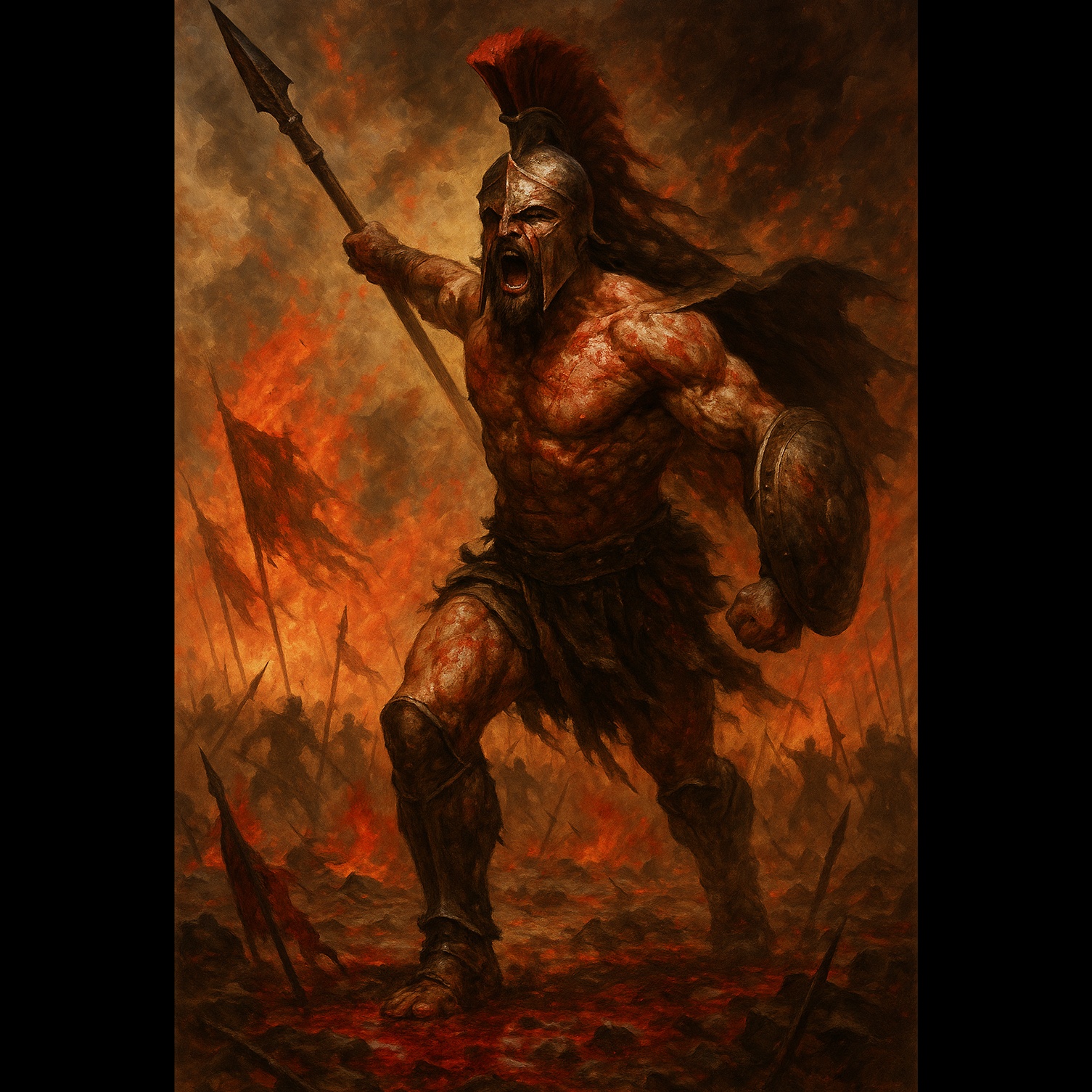 Compose a mid-tempo, battle-hardened power metal anthem in the style of epic war hymns, capturing the fury and might of Ares, god of war, Begin with pounding military drums, bronze shield impacts, and war horns, Set a marching tempo (≈120–130 BPM) with thunderous double bass and tight, chugging rhythm guitars, Riffs should be heavy, heroic, and warlike — using Phrygian and Dorian modes to conjure Greek tension and mythic aggression, Vocals must be commanding and operatic with a dark, charismatic edge, Use backing choirs to chant “Ares! Ares!” like a battlefield chorus, Choruses should be massive, singable, and fierce — each one different, with rising progressions and mythic declarations, Add dramatic organs or war horns for tension between verses, Optional short break with distorted ancient Greek instruments (lyre, aulos) before launching into the final chorus, End with echoing drums and a final crash — as if the battlefield is silenced by the god’s victory