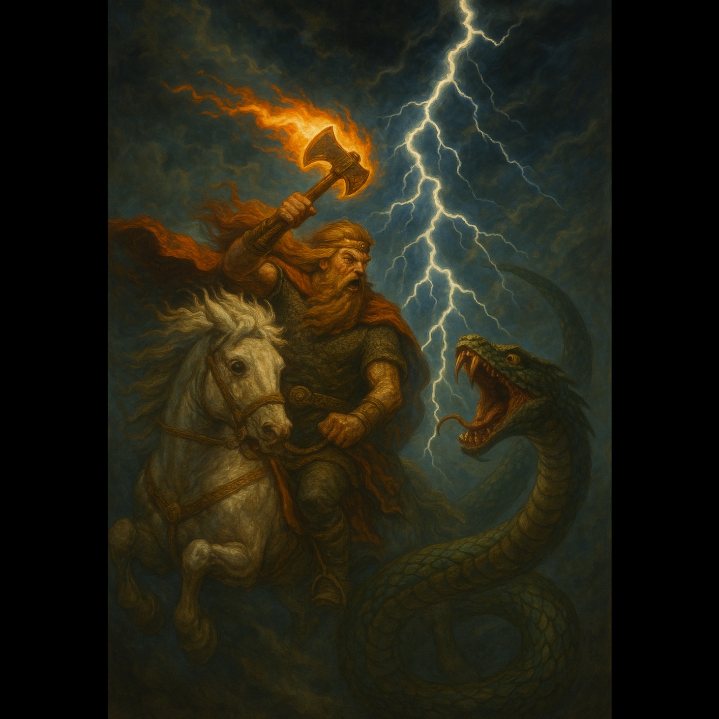 Compose an epic power metal anthem at 150 BPM inspired by Perun, Slavic god of thunder, Open with war drums, distant thunder, and Slavic flute or gusle melodies, transitioning into fast double-bass drumming and triumphant guitar riffs, The tone is heroic and intense, with symphonic accents, Verses should sound like marching into stormy battle; pre-choruses build pressure with rising harmonies, Each chorus explodes like lightning — bold, chantable, and divine, Include a Slavic folk-inspired solo section with thunderclaps layered behind, The sound should feel mythic, storm-forged, and ancestral, as if the god himself rides across the sky in righteous fury