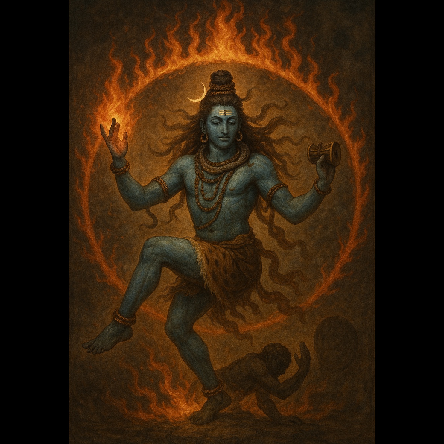 Compose a majestic, furious power metal anthem that embodies Shiva, the god of destruction, meditation, and rebirth, Open with conch shells, temple bells, and low drone chants like "Om Namah Shivaya" beneath thunderous dhol and tabla rhythms, Use deep, distorted guitars with Eastern modes (Phrygian, Bhairav, Double Harmonic) to mirror Shiva’s cosmic fire and divine fury, Vocals must be commanding and godlike — baritone to mid-range, alternating between solemn chanting and eruptive declarations, Blend Indian classical instruments (sitar, bansuri, tanpura drones) into the metal core, Percussion should mimic the Tandava — pulsing, primal, relentless — invoking creation through destruction, Include Sanskrit fragments or call-and-response mantras in the chorus, The solo should resemble a storm: chaotic, beautiful, transformative, End with fading fire, wind, and chanting — as if Shiva’s dance has ended and silence reigns