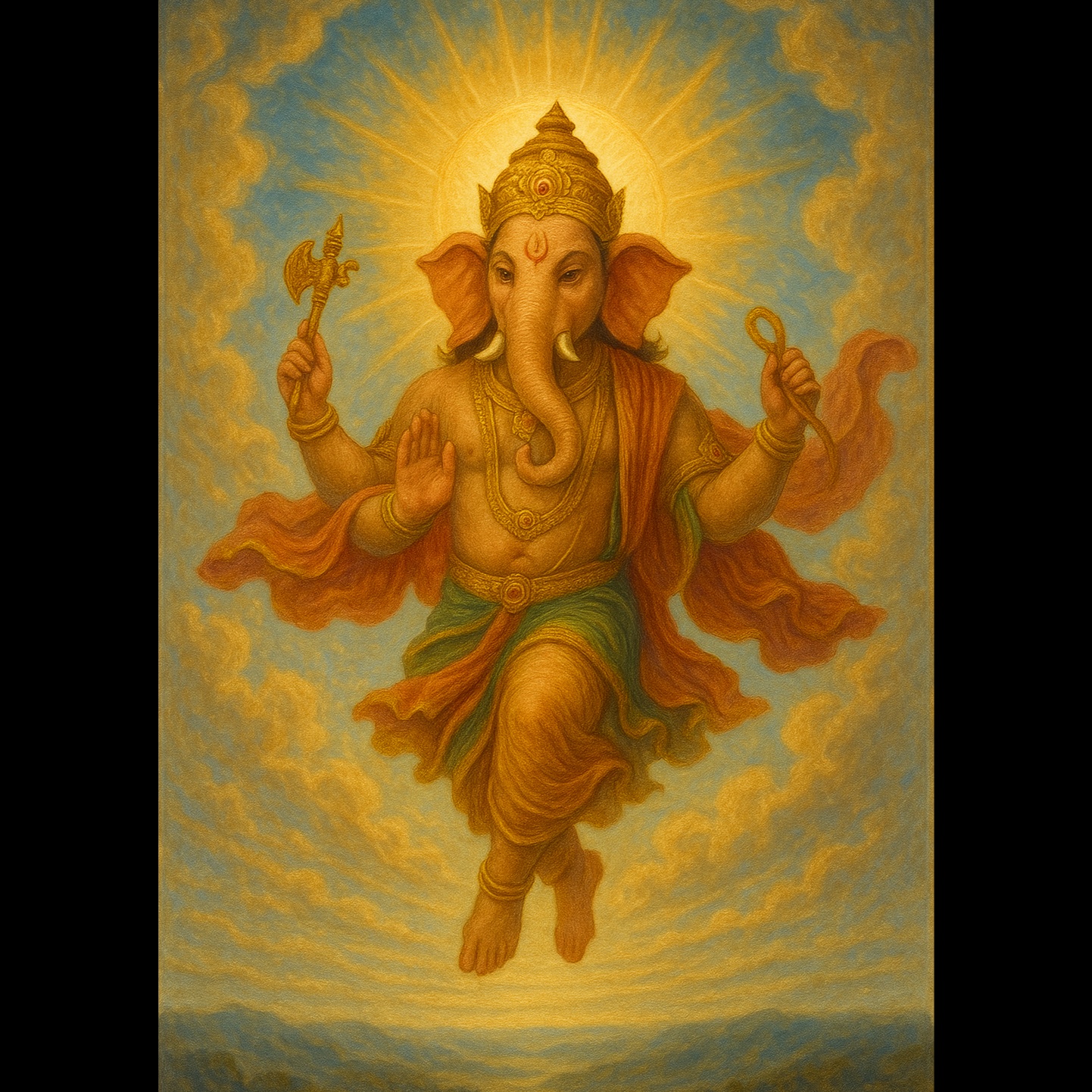 Create a triumphant and divine metal anthem centered on Ganesha, the remover of obstacles and lord of wisdom, Begin with the sound of conch shells, temple bells, and rhythmic tabla — a ceremonial opening that invokes ancient India, Introduce low, resonant dhol drums beneath shimmering sitar phrases or bansuri melodies, then rise into power-chord-driven guitars with Eastern scales (Phrygian dominant, Mixolydian) to mirror the spiritual and warrior-like tone of Indian mythology, Lead vocals must be deep, heroic, and commanding — with choruses backed by layered choirs that echo mantras or Sanskrit-inspired syllables, Use call-and-response chanting, battle-march drumlines, and interludes with Indian classical motifs to bridge verses, Choruses should sound like divine declarations, not just melodies, Include sound effects like elephant steps, thunder, or sacred fire to emphasize Ganesha’s celestial presence, End with fading chants, bells, and a final drum hit