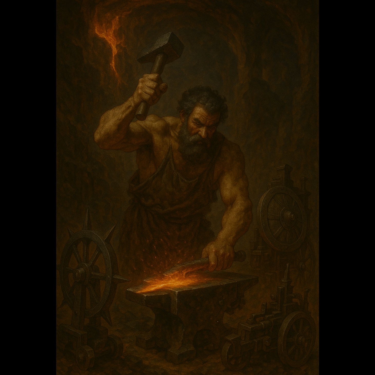 Compose an epic, fast-paced power metal anthem (~130–135 BPM) with a heroic and fiery atmosphere, Begin with pounding drums and industrial hammering sounds to simulate a divine forge, Layer in triumphant guitars and orchestral brass hits to evoke the grandeur of gods at war, Use heroic minor and Dorian scales for a molten yet uplifting tone, Verses should be rhythmic and driving, with clear, storytelling vocals, Pre-choruses should rise with galloping drums and tension-building harmonies, The chorus must be bold, catchy, and singable—ideal for crowd chants—with soaring vocals and choir backing, Add a fiery guitar solo with metallic, melodic phrasing, like sparks flying from the forge, Include occasional hammer clanks and fire sounds for immersion, End with echoing anvils and fading embers to complete the divine blacksmith’s tale