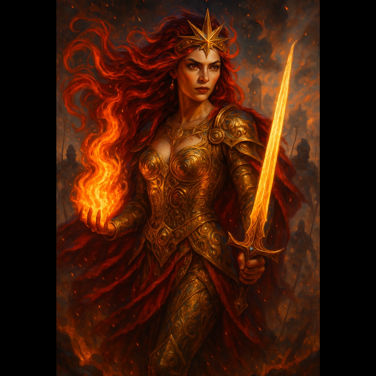 Compose an energetic, epic power metal anthem at ~130 BPM celebrating Ishtar, goddess of love and war, Begin with bright, soaring guitars and fast-paced drums, layered with majestic keyboards, Verses combine rhythmic galloping riffs with powerful storytelling vocals, Pre-choruses build with harmonized choir backing and melody, The chorus explodes into anthemic, catchy hooks, blending themes of passion, fire, and battle, Include a melodic, uplifting guitar solo with symphonic underlays, The atmosphere should balance fiery intensity with regal elegance, evoking a goddess both fierce and seductive, End with fading choir and thunderclap
