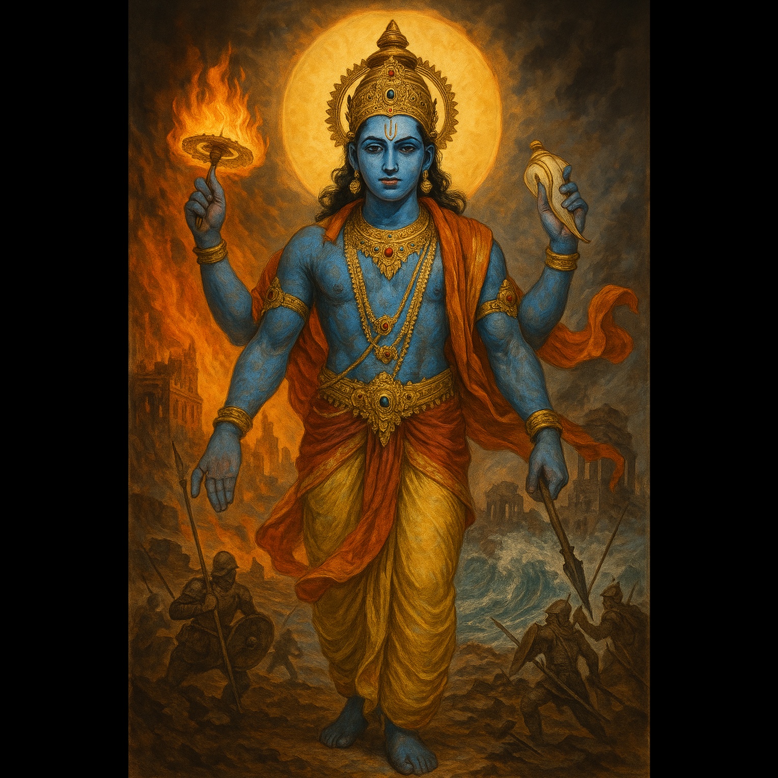Create a radiant and powerful power metal anthem that honors Vishnu, the preserver and cosmic protector, Begin with temple bells, a shimmering tanpura drone, and choirs chanting “Om Namo Narayanaya, ” then rise into a grand orchestral-metal fusion, Use Indian classical instruments (sitar, bansuri, tabla) layered with heroic guitars in Lydian or Phrygian dominant modes to evoke divinity and nobility, Lead vocals should be bold and regal, delivering each verse with unwavering grace and cosmic certainty, Include soaring choirs to echo ancient mantras and chorus lines that sound like sacred proclamations, Percussion should combine Indian rhythms with epic double bass drums to symbolize Vishnu’s avatars descending into battle, Use conch shell blasts, shimmering pads, and orchestral sweeps to give the track a celestial feel, End on a peaceful choir over fading bells — like order being restored