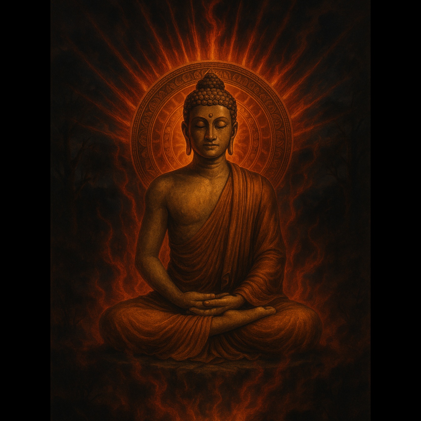 Create a majestic mid-tempo power metal anthem centered on Buddha as a divine conqueror of illusion, Begin with temple bells, meditative drones (tanpura or synth pads), and soft erhu or bamboo flute, Slowly introduce a chugging guitar rhythm (≈100–120 BPM) that feels grounded, unstoppable, and transcendent, Use Phrygian or Lydian ♯2 scales for an Eastern-mystical tone, layered with clean choruses of monks or choirs chanting mantra-like refrains, Lead vocals must be rich, solemn, and resonant — like a spiritual leader, not a warlord, The chorus should soar like a revelation, not an assault — using strings or synth to evoke divine clarity, Percussion should include taiko or dhol-style low toms, beating like the heart of the earth, A mid-song solo can blend sitar phrases with melodic shredding, representing enlightenment cutting through illusion, The song should end with bell chimes, soft wind, and a fading chant — as if the god has passed, but his truth remains